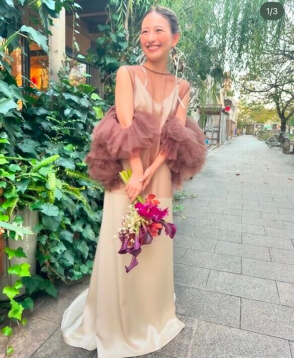 美品!2WAYカラードレス パーティードレス あずき色 キャミソール 2点セット ポンチョ ラッフルフリル チュールブラウス