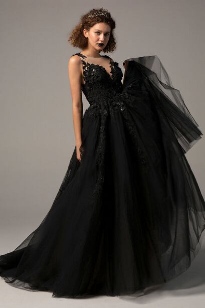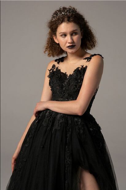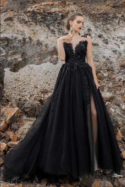 美品!3D立体レース刺繍 パーティードレス 黒 ブラックカラードレス 背中見せ/バックレス フロントスリット イブニングドレス