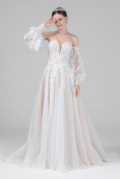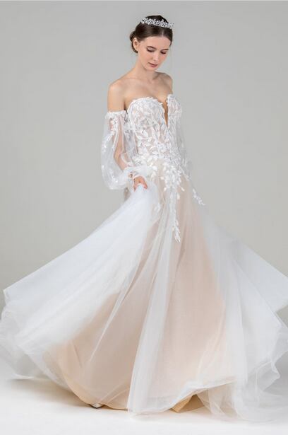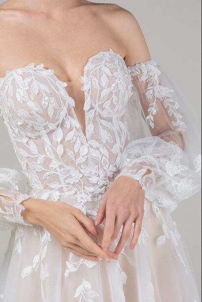 美品!ロングパフスリーブ ウエディングドレス リーフモチーフ刺繡 アイボリー色 Aラインドレス ハートカット オーダードレス