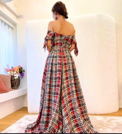 美品!ツイードドレス パーティードレス カラードレス 優雅なシルエット レッドカラー イブニングドレス 編み上げ式