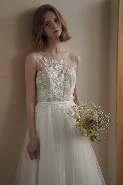 美品!花モチーフ刺繡 ウエディングドレス ノースリーブ 妊婦ドレス 洗練なふんわりチュールドレス パーティードレス