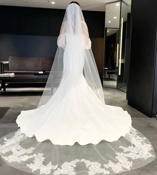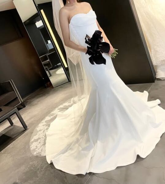 美品!マーメードスタイル 取り外し袖 ウエディングドレス クレープ生地 ヒップライン 綺麗なシルエット スレンダーライン フレアスカート