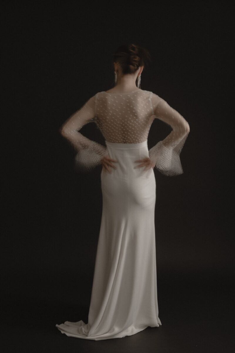 美品!フロントスリット ウエディングドレス ロングスリーブ スレンダーライン 女性らしさ溢れる曲線美 優しいホワイトのニュアンス パーティードレス
