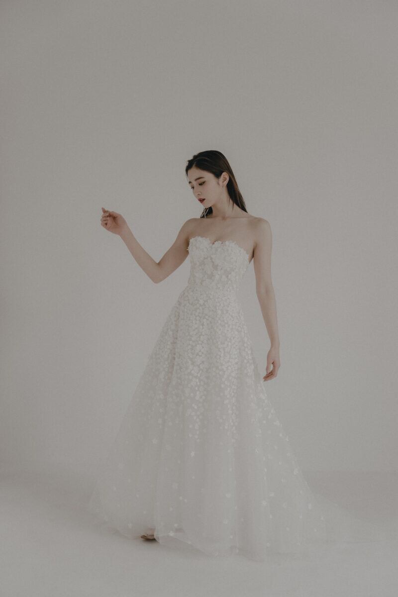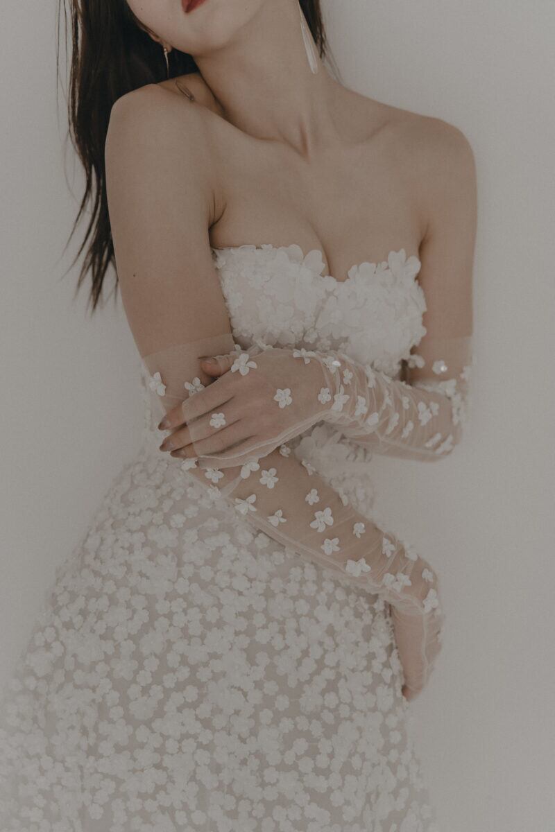 ゴージャス!繊細レース ハンドメイドのエンブロイダリーフラワー 女性らしくセクシーなウエディングドレス フラワーモチーフグローブ スレンダーライン