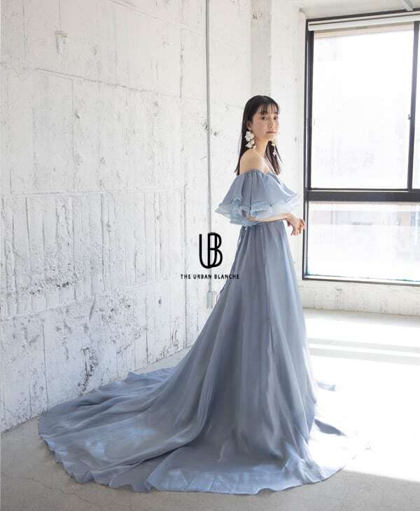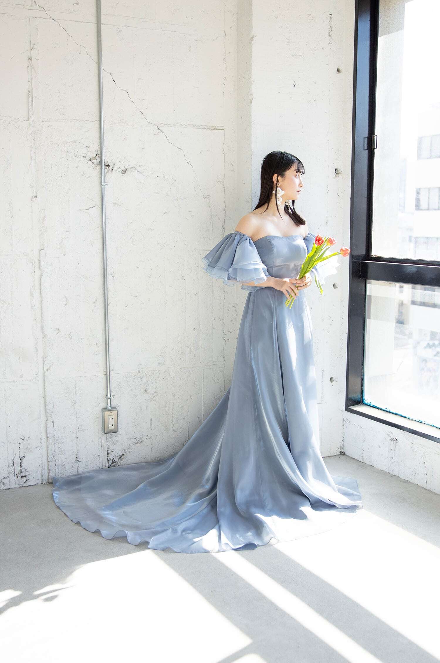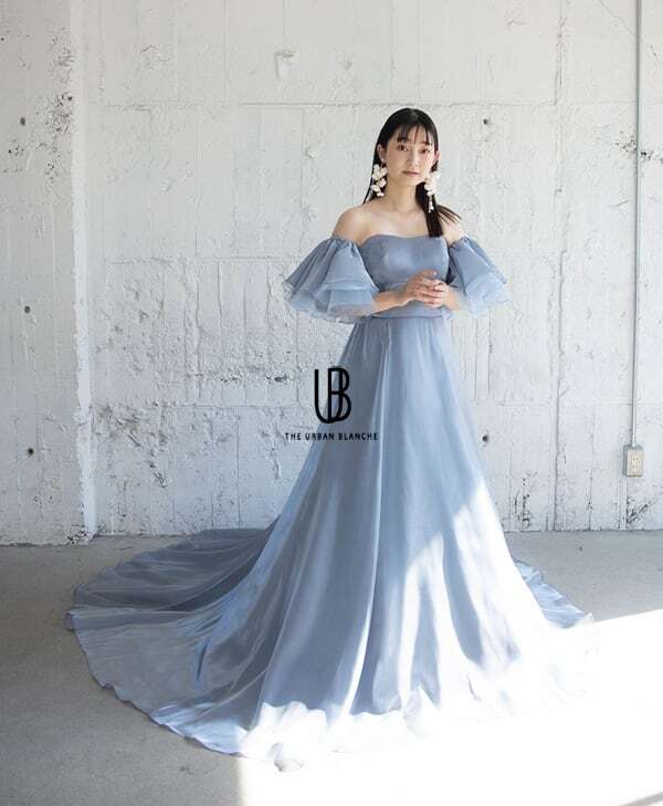 美品!くすんだ青 パーティードレス フレアスリーブ ブルーカラードレス 上質オーガンジー ロングトレーン ミディアムドレス ナイトドレス