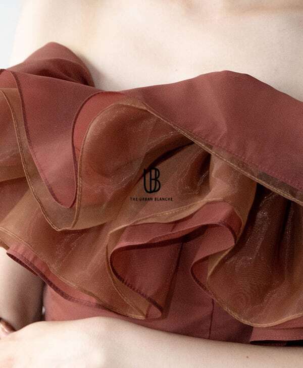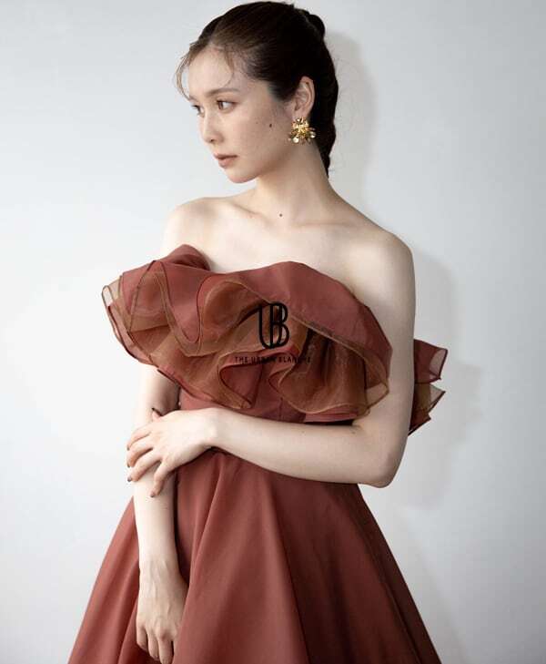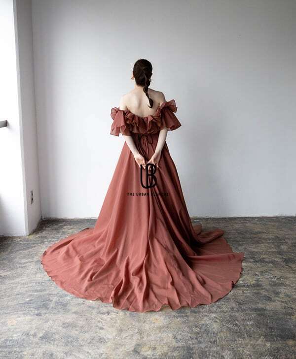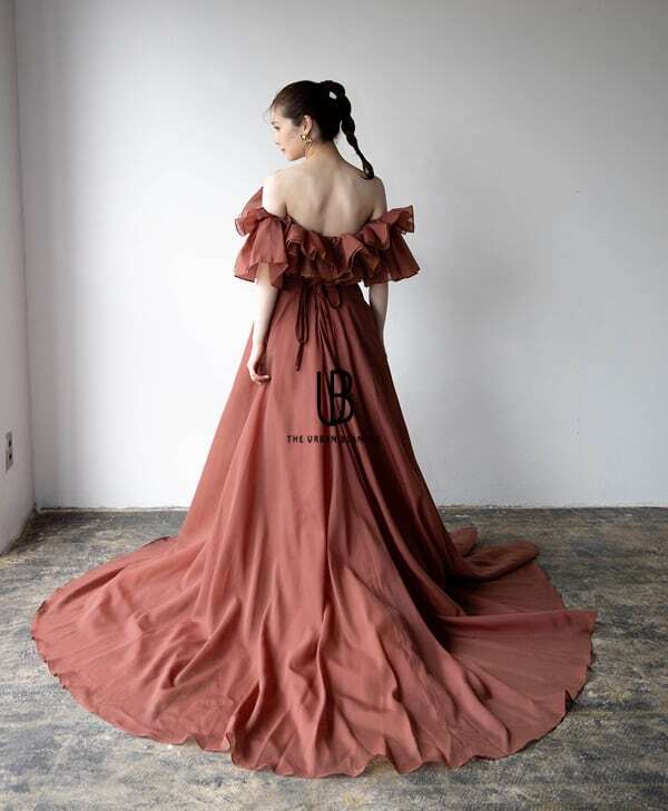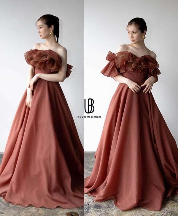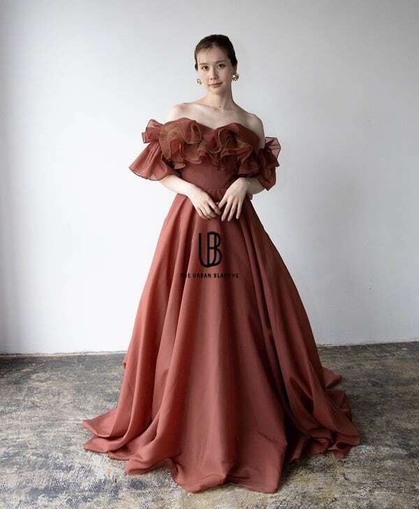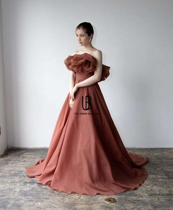 美品!テラコッタ色 くすんだレッド色 パーティードレス 取り外し袖 カラードレス ビスチェスタイル フリル Aラインドレス