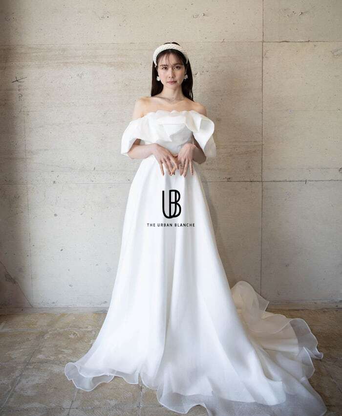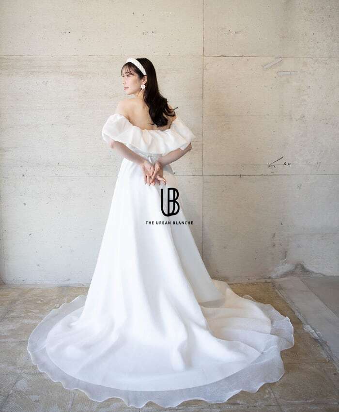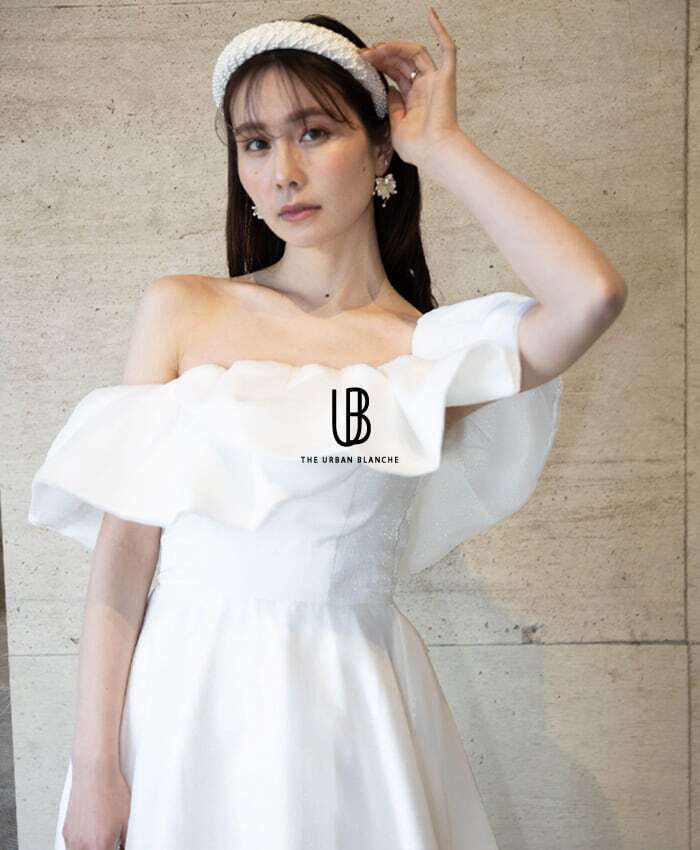美品!フリルオフショルダー パーティードレス ウエディングドレス Aラインドレス 高みせ 細見えシルエット エレガント