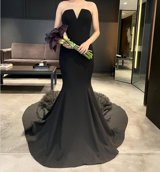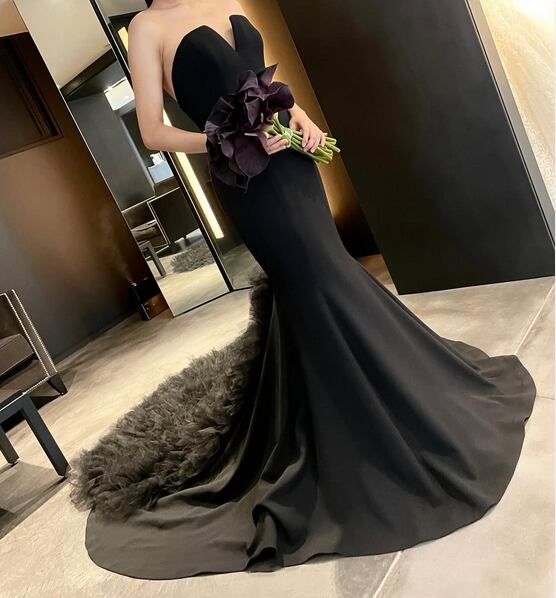 美品!黒 パーティードレス 取り外し袖 ブラックカラードレス ビスチェスタイル もこもこフリルトレーン マーメードドレス