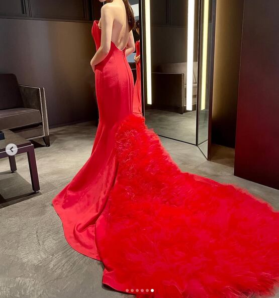 美品!赤 パーティードレス 鮮やかなレッドカラードレス ビスチェスタイル もこもこフリルトレーン ロングトレーン マーメードドレス