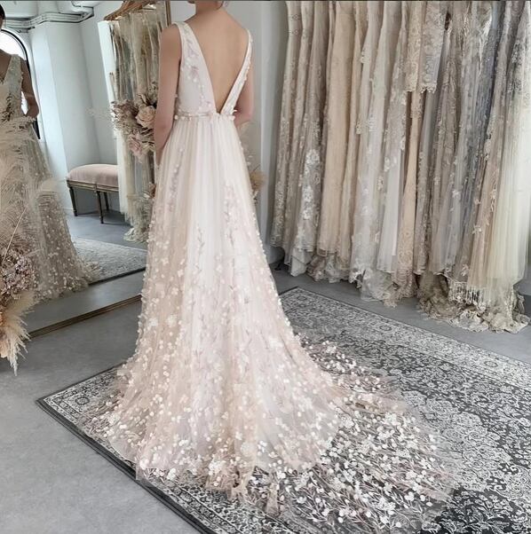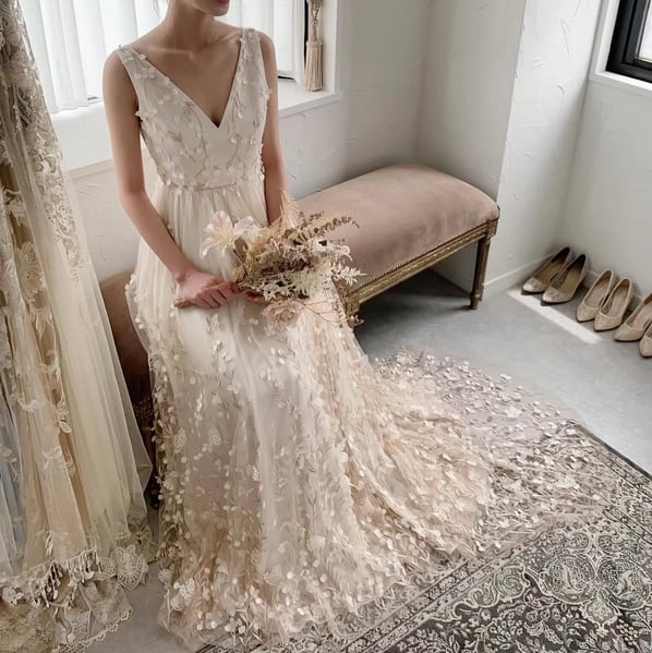 ゴージャス!枝花刺繍 Vネック ノースリーブ ウエディングドレス 優しいピンクベージュカラー モダンテイスト ソフトチュール
