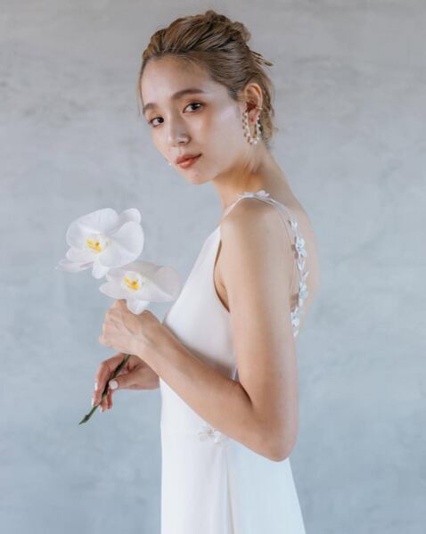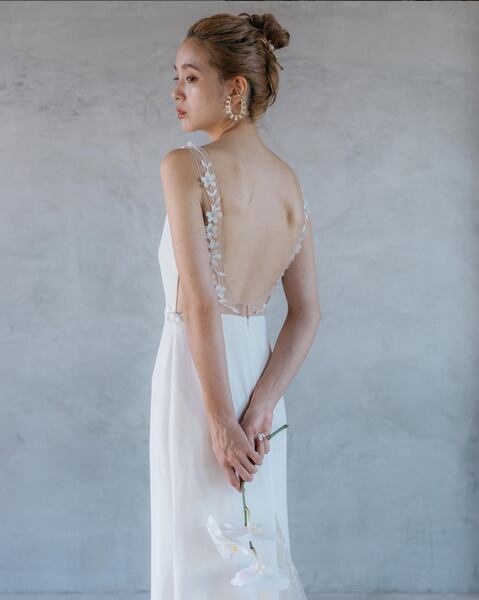 美品!枝花刺繍 ラウンドネック ノースリーブ ウエディングドレス 優しいオフホワイト グレープ素材 マット生地 モダンテイスト