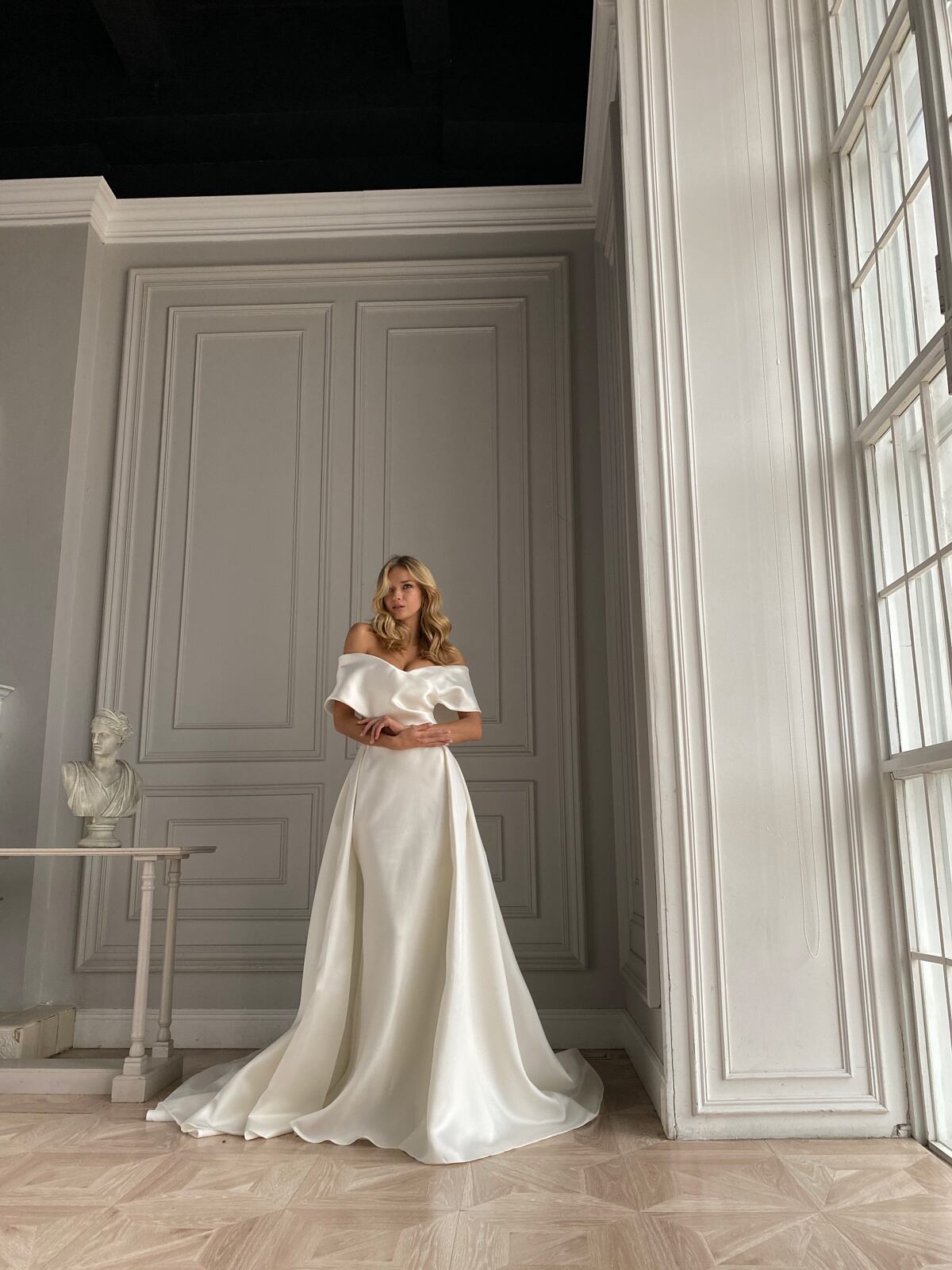 美品!フランス風2WAYウエディングドレス オフショルダー ロングトレーン オーバードレス マーメードスタイル ラップスカート パーティードレス