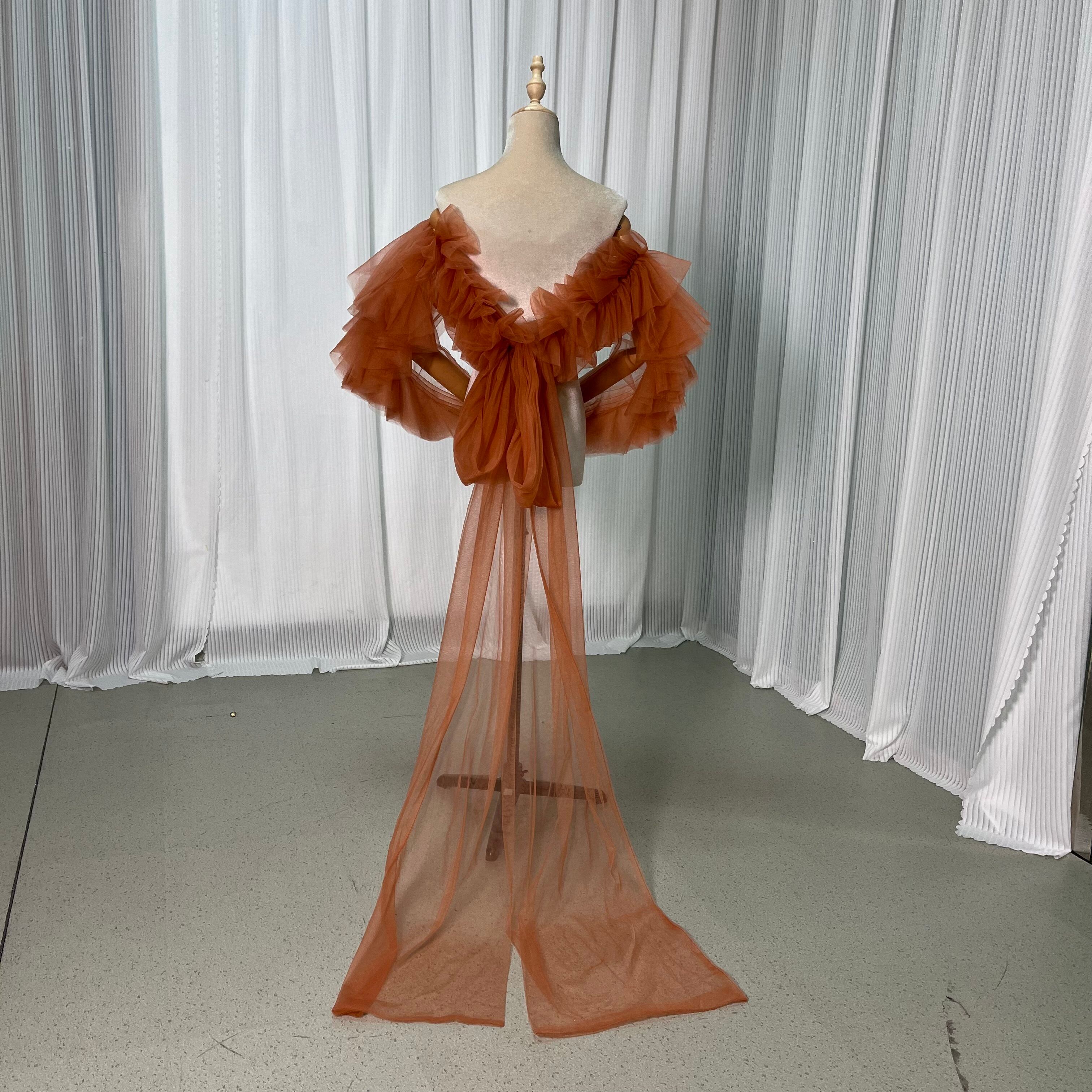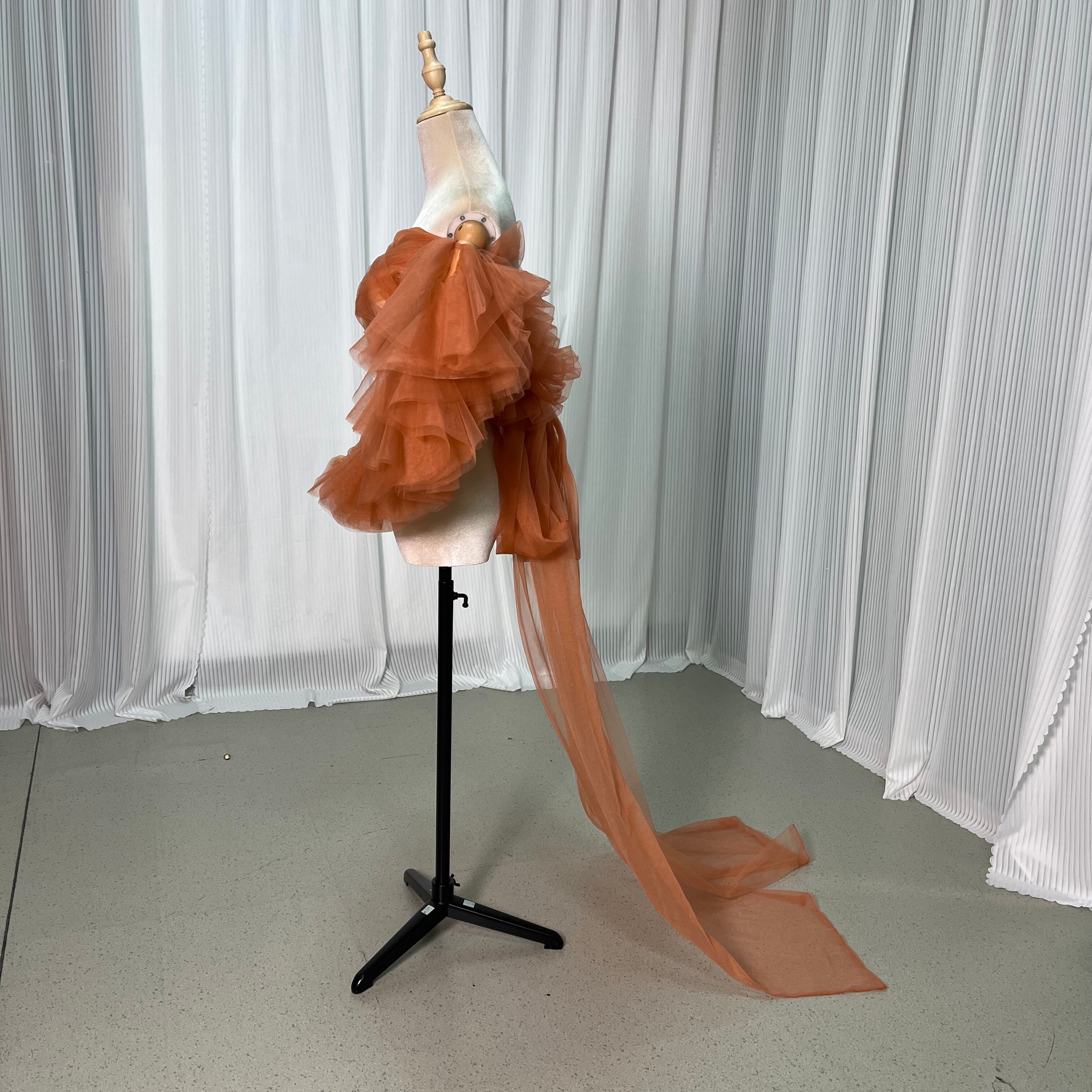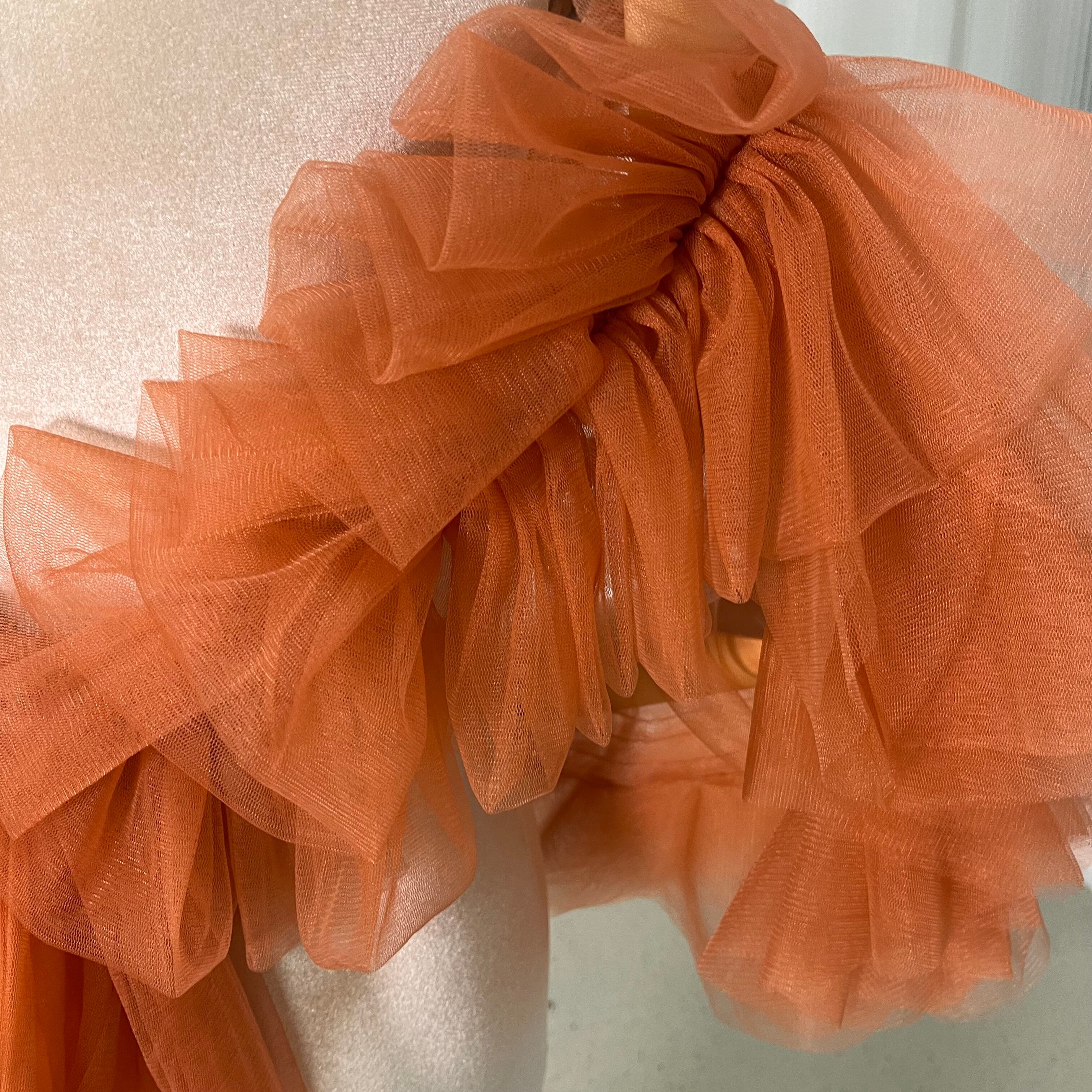 送料無料!美品!テラコッタ色 ソフトチュール フェミニンなフレームレースの袖トップス 花