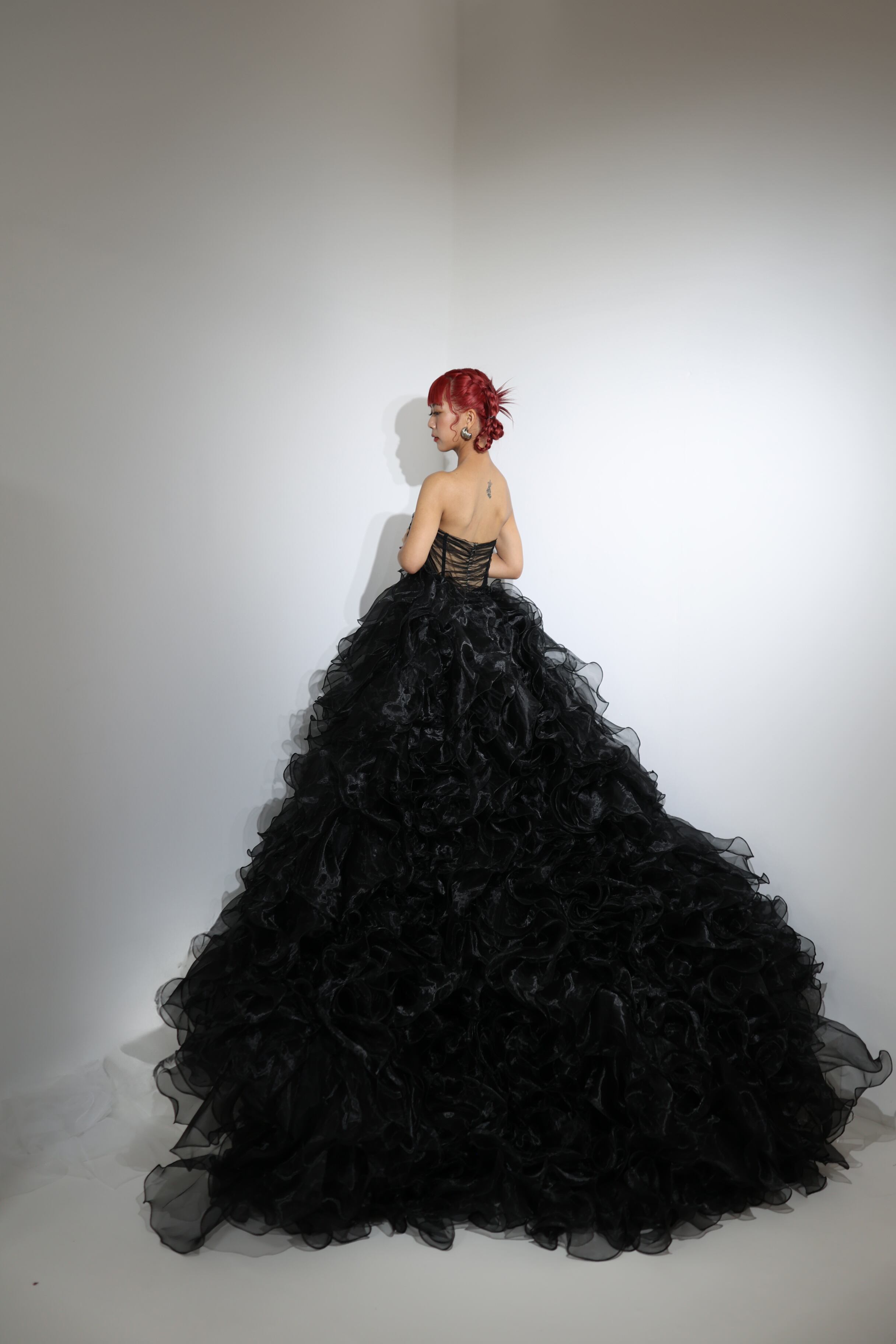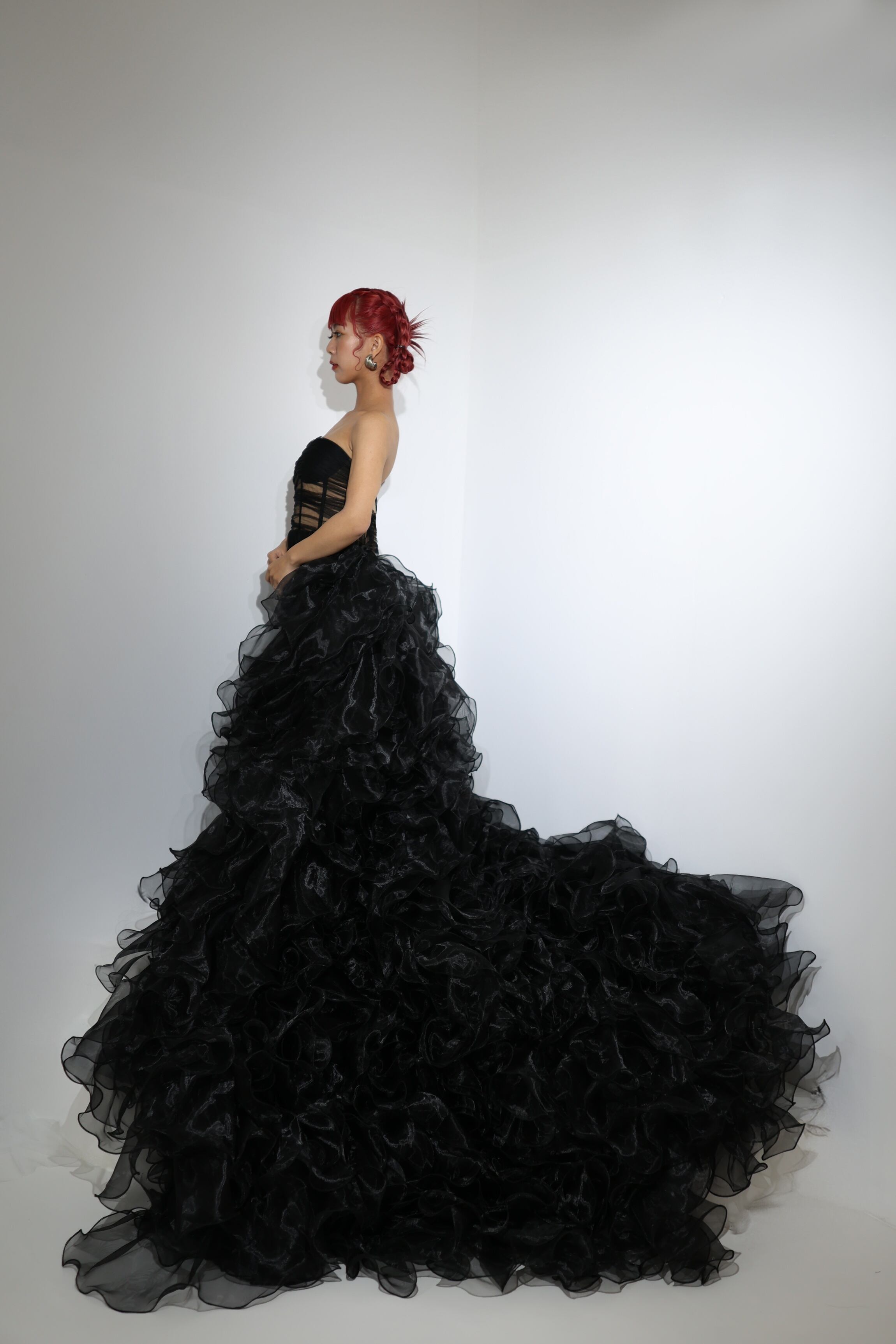美品!黒 ベアトップ カラードレス 柔らかく重ねたチュールスカート /前撮り/花嫁/結婚式
