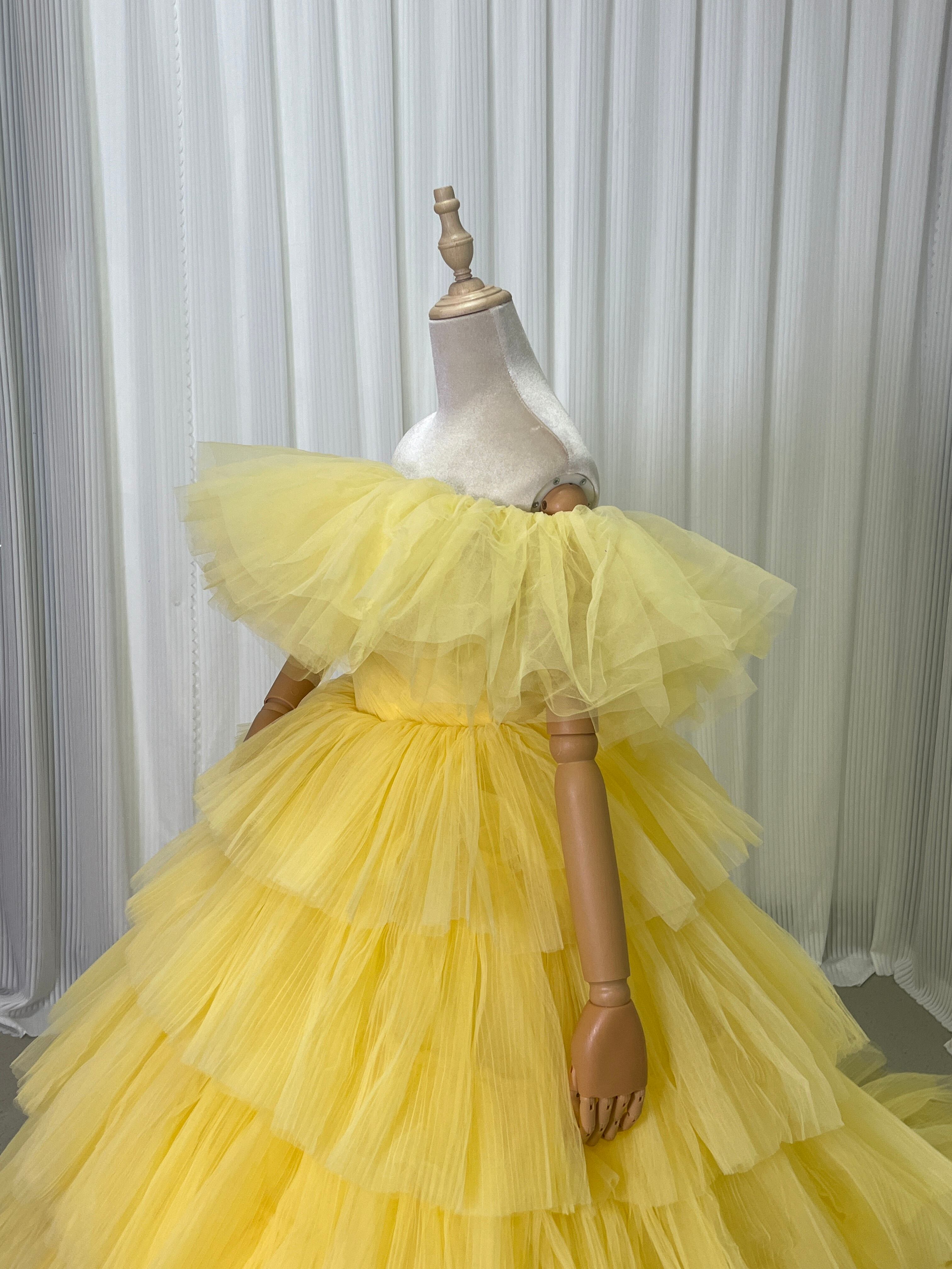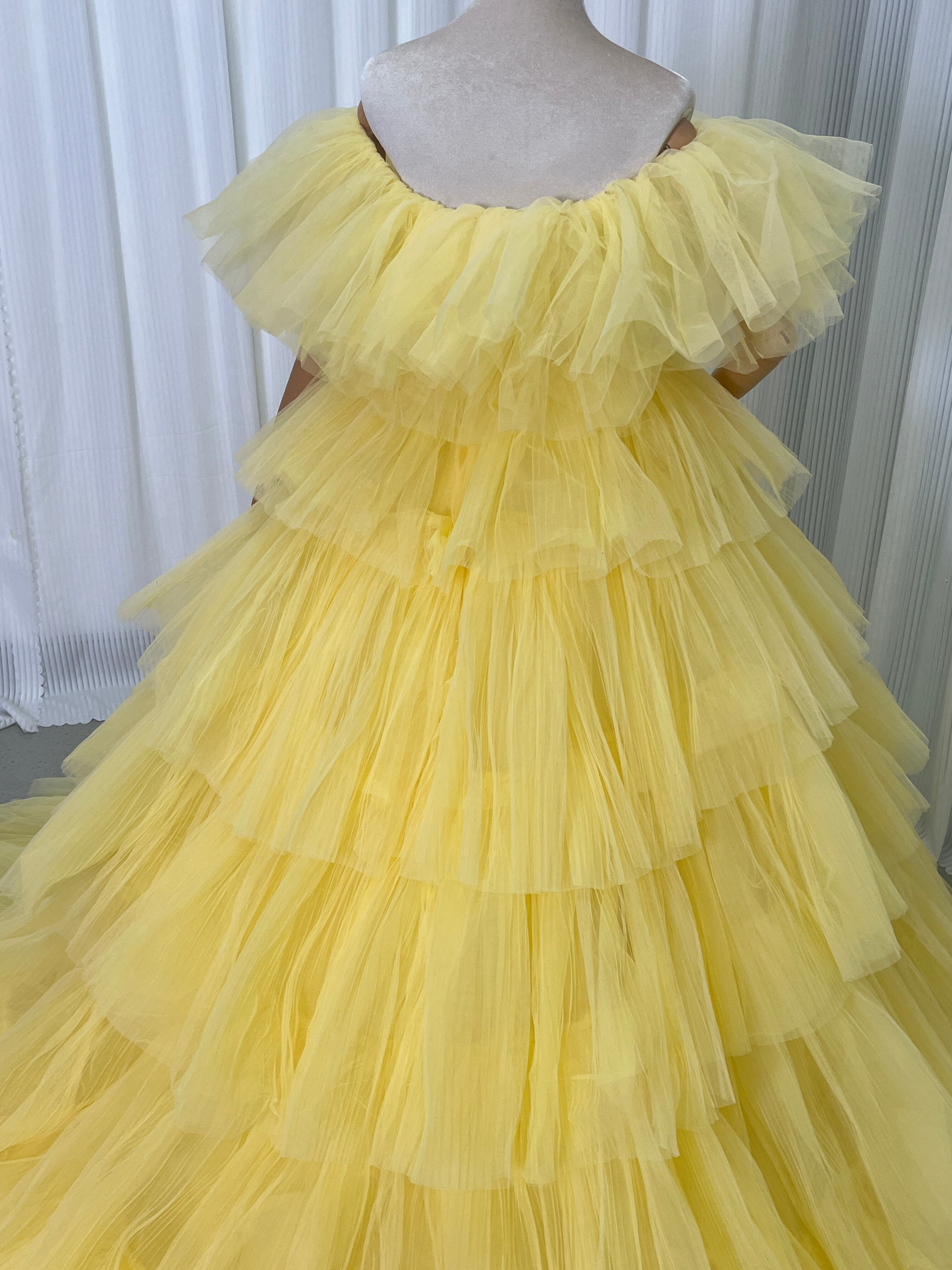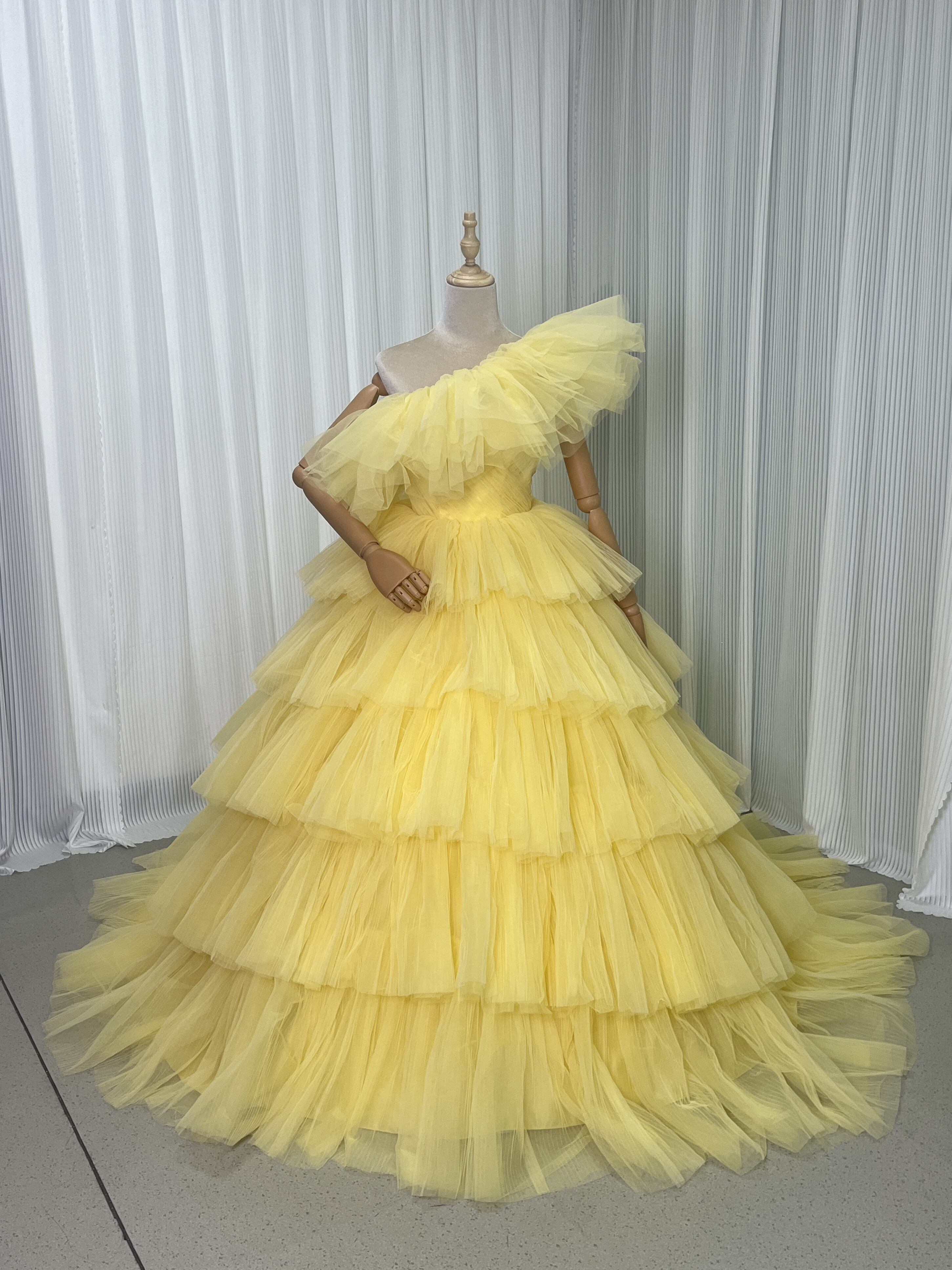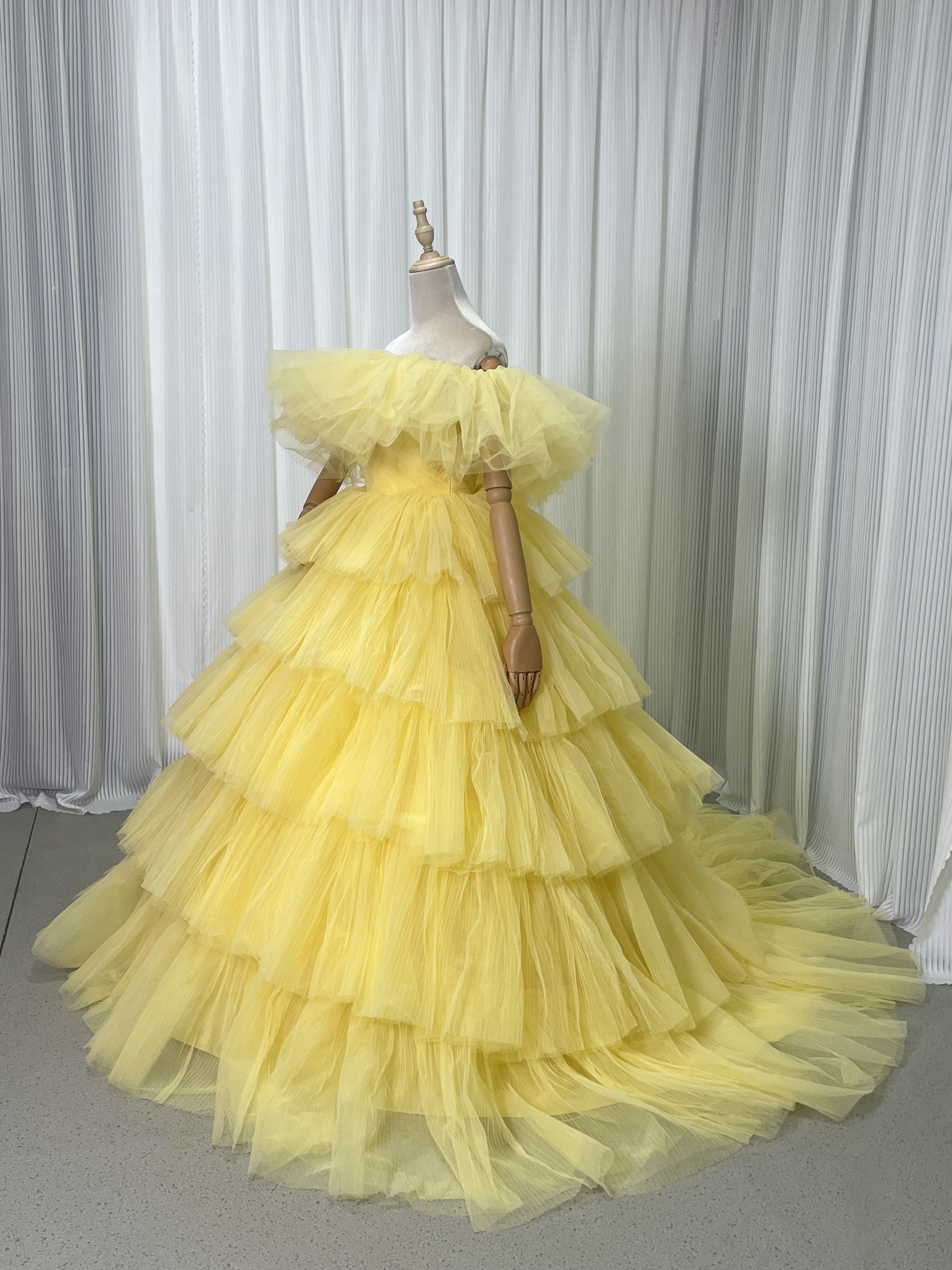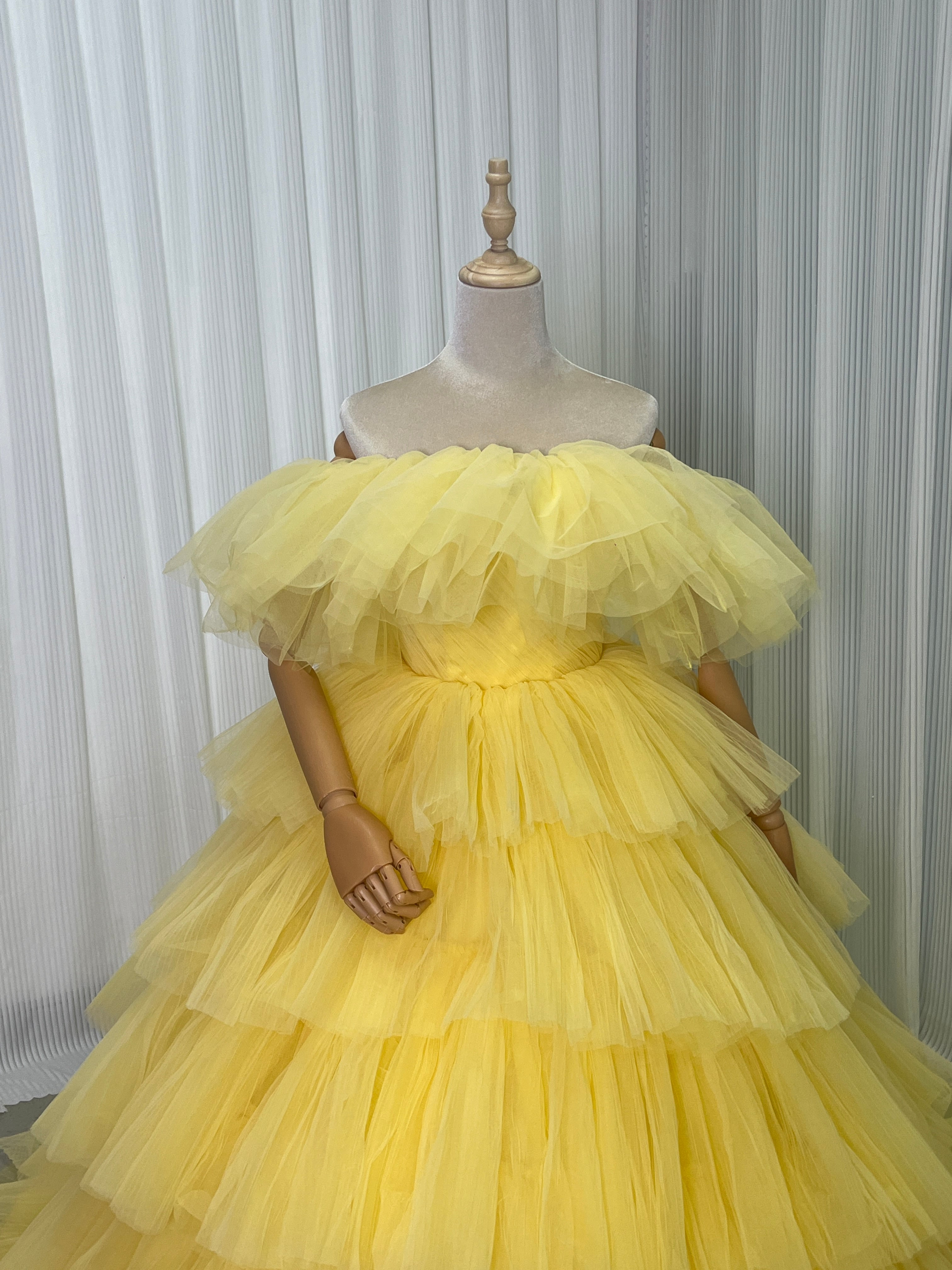 取り外しオフショルダーイエロー カラードレス 韓国風ドレス チュールドレス もこもこフリルドレス ボリューミー 前撮り