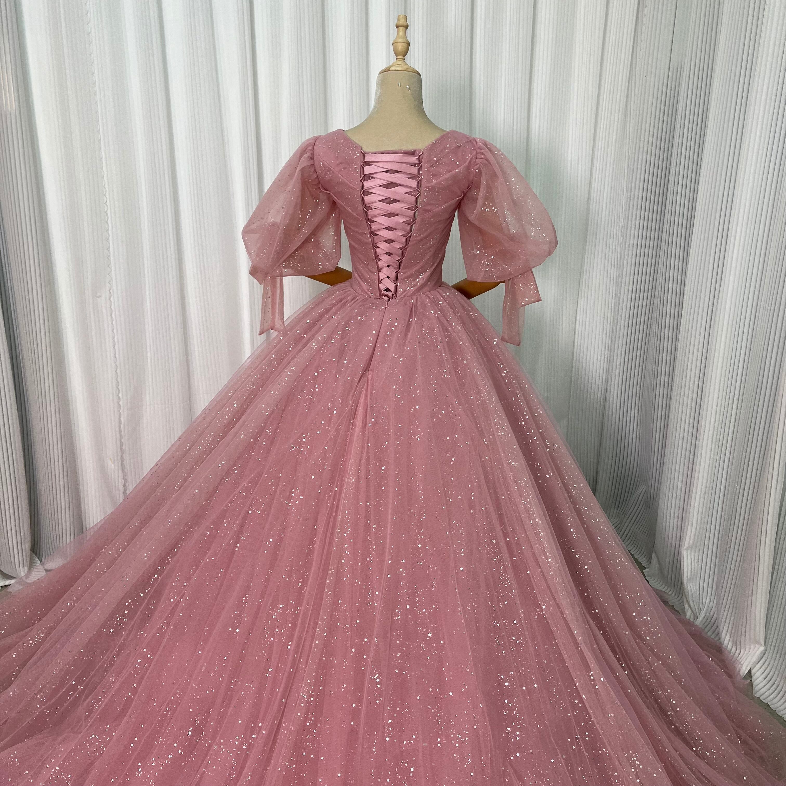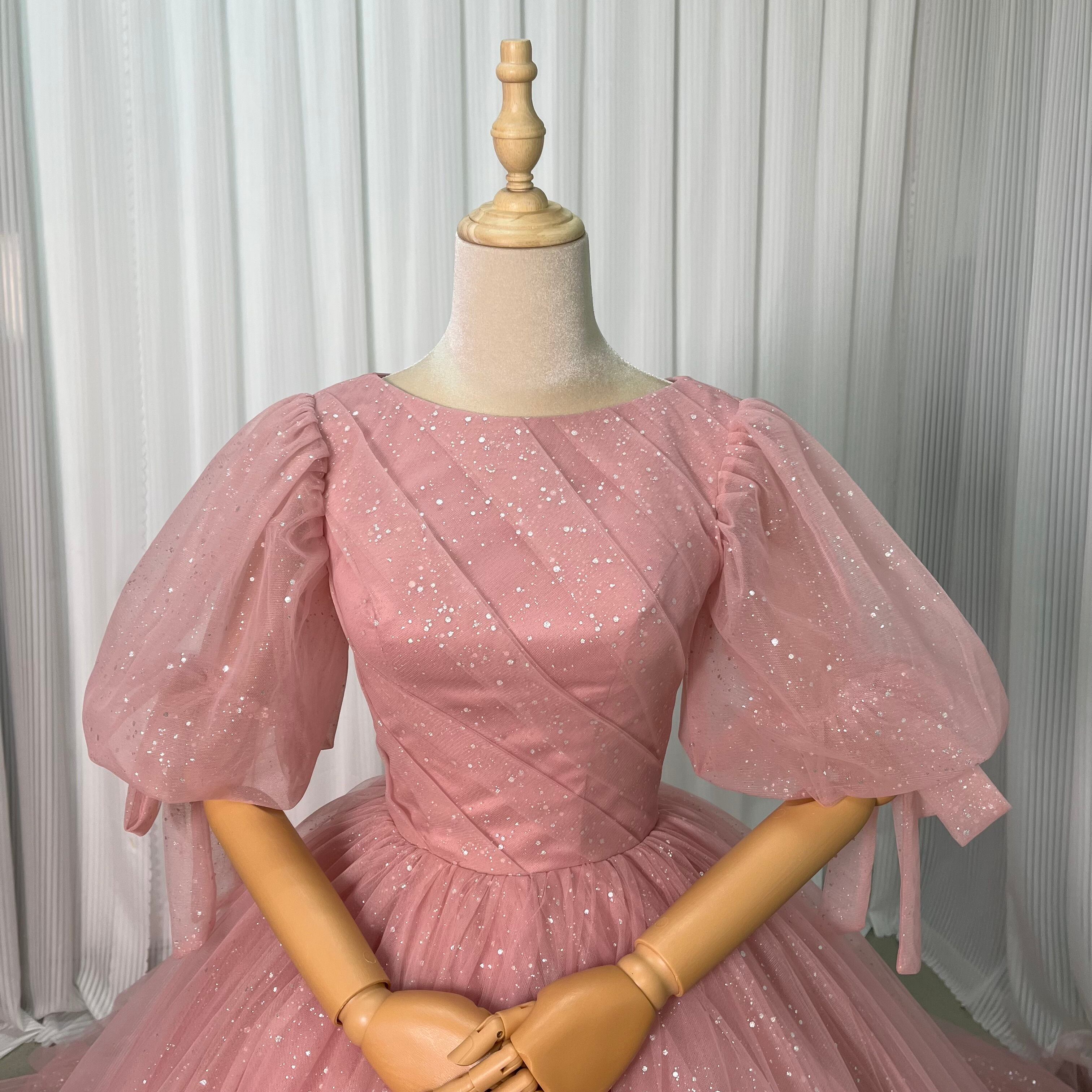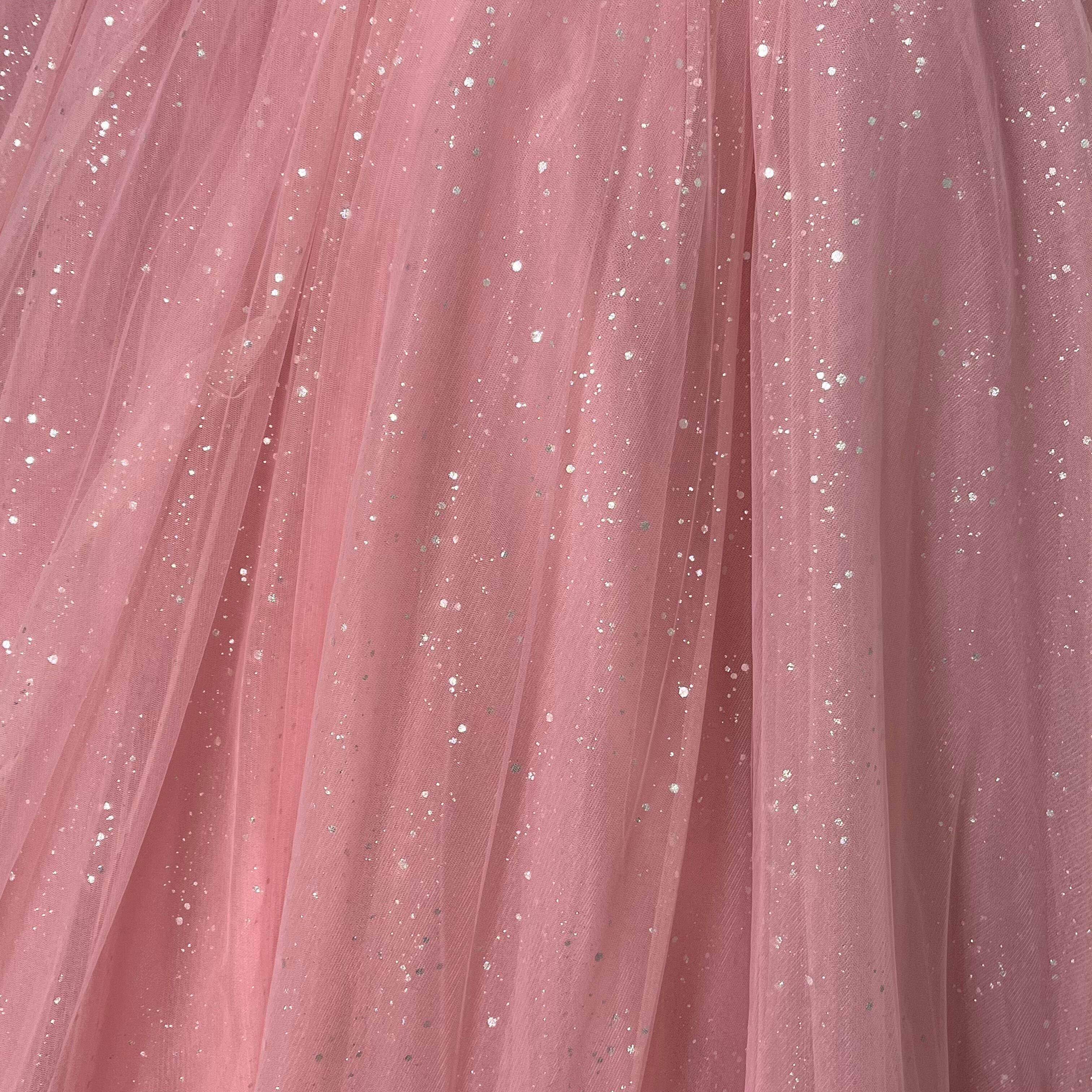 美品!ピンク キラキラグリッターチュール カラードレス ロングトレーン ビジュードレス 前撮り/花嫁/結婚式