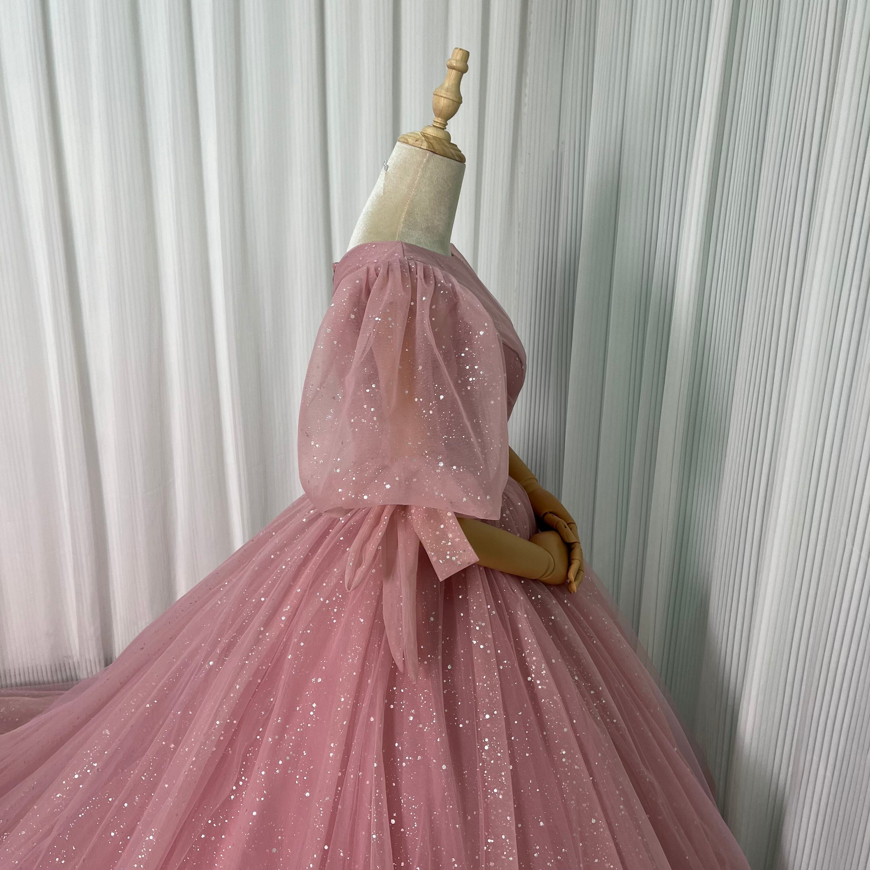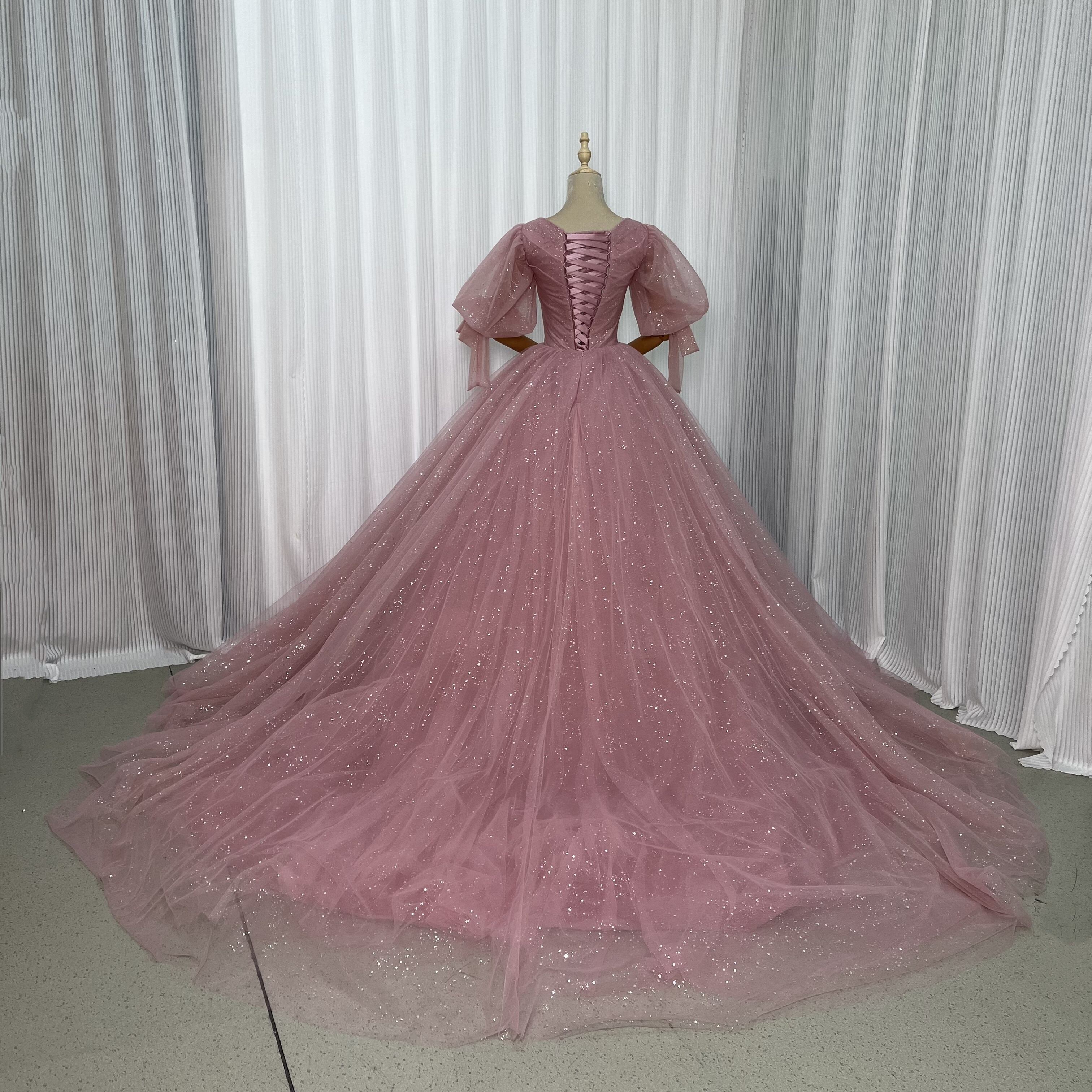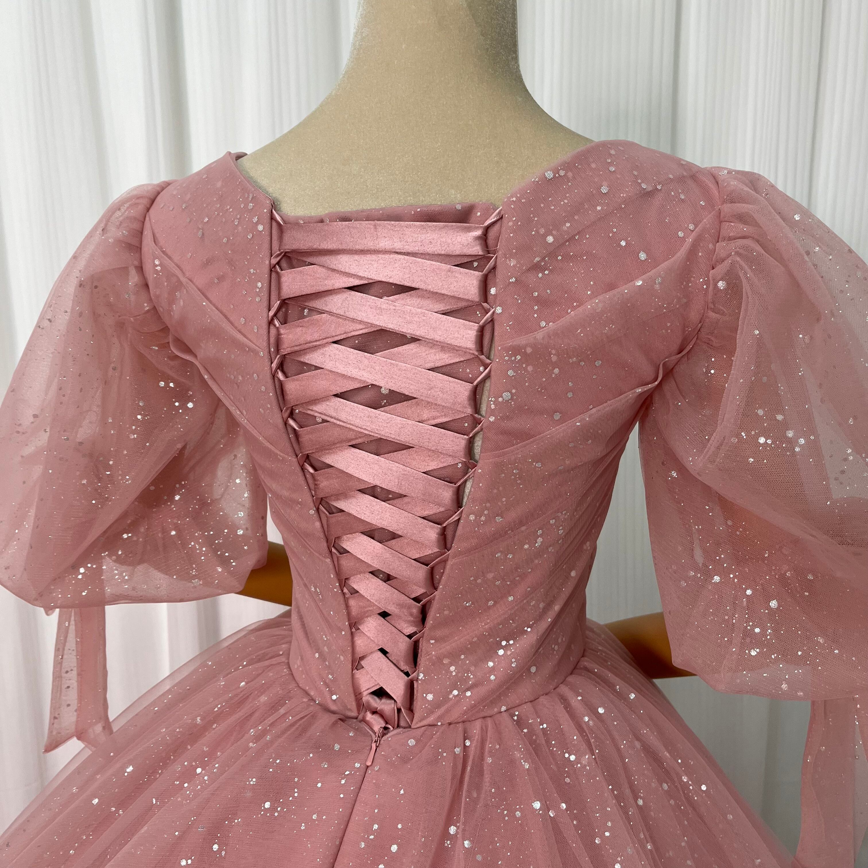 美品!ピンク キラキラグリッターチュール カラードレス ロングトレーン ビジュードレス 前撮り/花嫁/結婚式