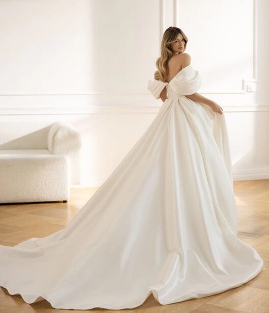 美品!フランス風ウエディングドレス オフショルダー ロングトレーン ドレープ 高みせ 細見えシルエット Aラインドレス パーティードレス