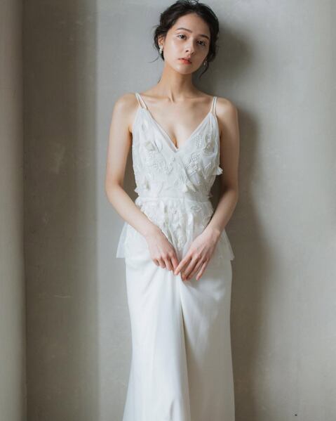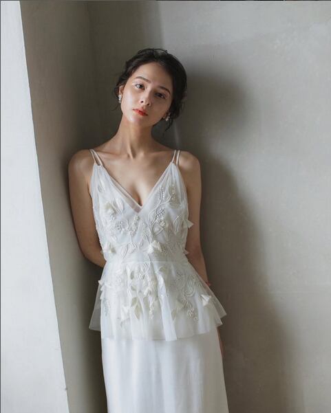 美品!枝花刺繍 エレガント Vネック 3D立体レース刺繍 キャミソール ウエディングドレス ストレートスタイル モダンテイスト ソフトチュール