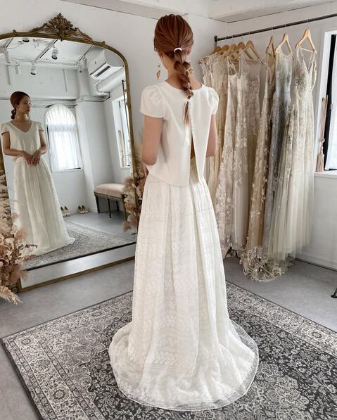 美品!セパレートドレス Vネック 半袖 シンプルなウエディングドレス 総レーススカート マット生地 パーティードレス ガーデンウェディング