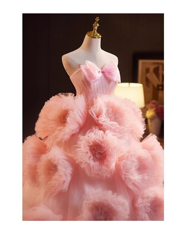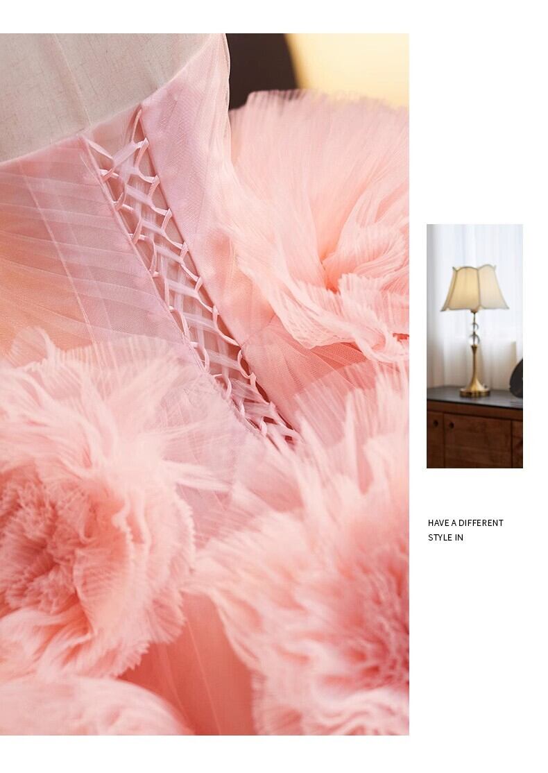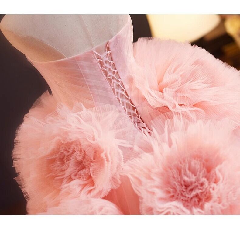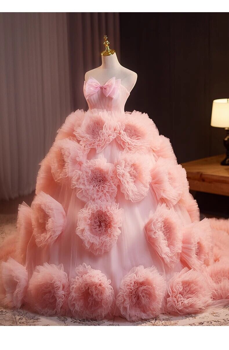 ピンク カラードレス チュールドレス上品花レース もこもこフリルドレス ボリューミー 前撮り