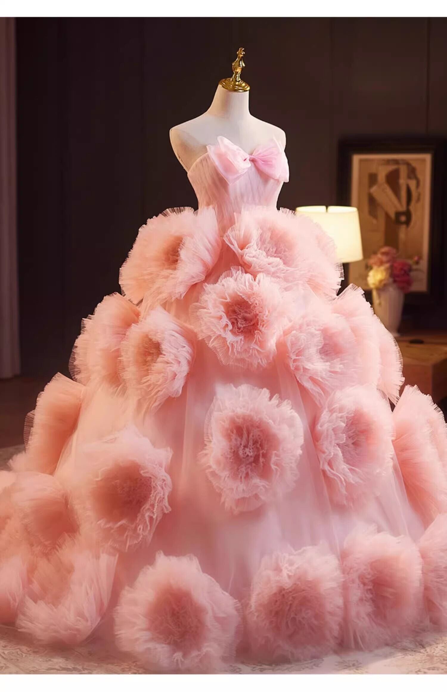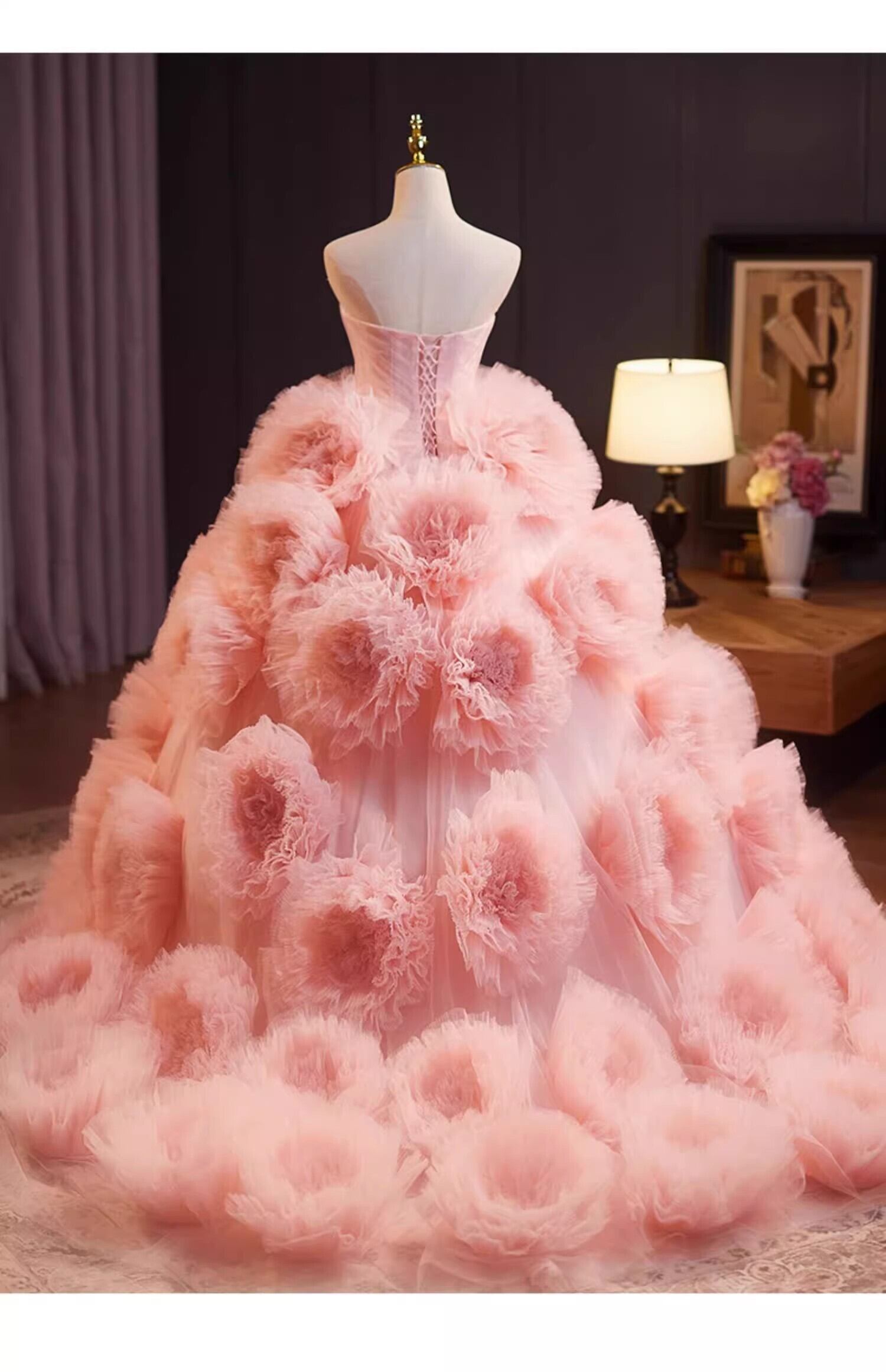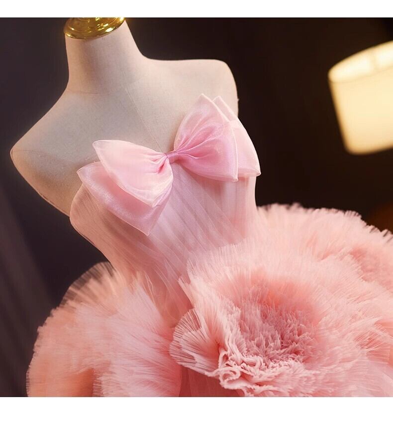 ピンク カラードレス チュールドレス上品花レース もこもこフリルドレス ボリューミー 前撮り