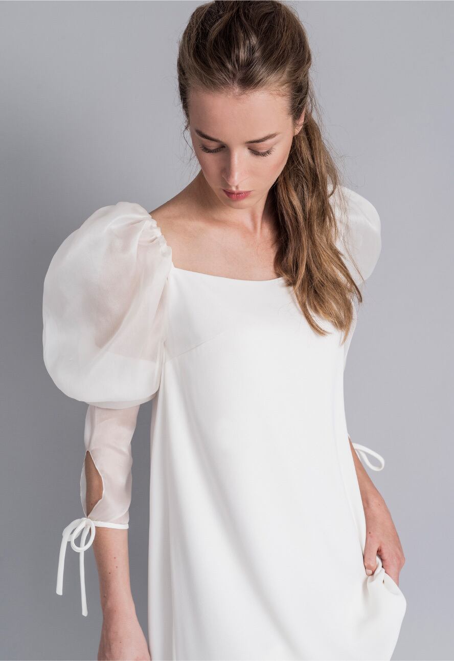 美品!七分袖丈 パフスリーブ ウエディングドレス スクエアネック ストレートスタイル ラグジュアリーフェミニン ミディアムドレス 女性らしいパーティードレス | David1021k Dress(ダヴィドレス)