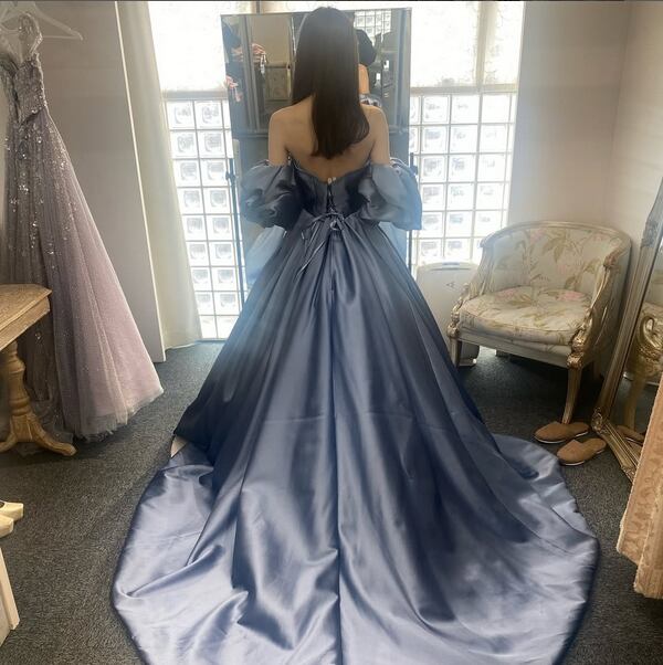 美品!取り外しオフショルダー カラードレス パフスリーブ ヒヤシンスブルー パーティードレス Aラインドレス ミディアムドレス