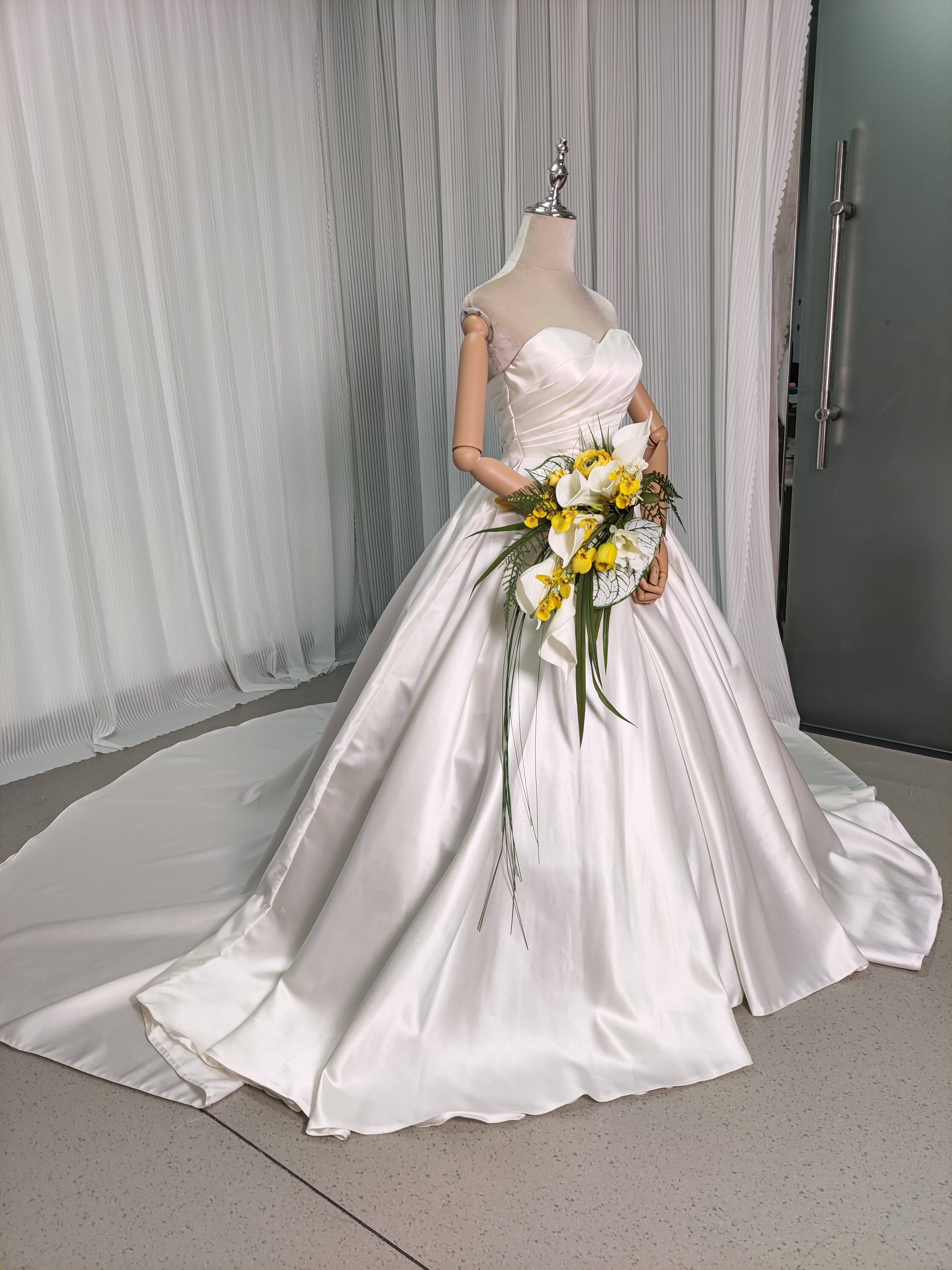美品!オフショルダー ウエディングドレス Aラインドレス 胸元にタックを寄せるスタイル 高みせ 細見えシルエット ロングトレーン