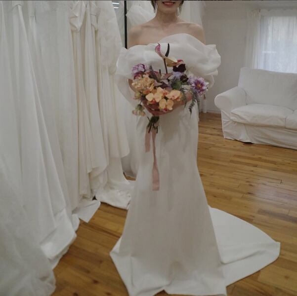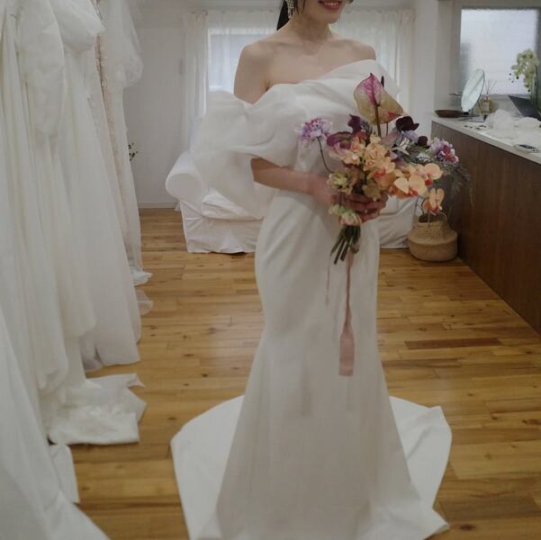 美品!オフショルダー ウエディングドレス マーメードスタイル スレンダーライン 高みせ 細見えシルエット 美しいボディライン