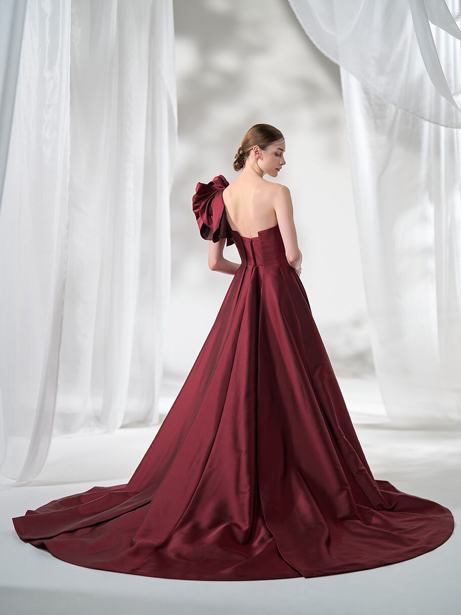 美品!ワンショルダー バーガンディーカラードレス 濃い赤紫色 ボルドー色 パーティードレス 優雅なシルエット ミディアムドレス Aラインドレス