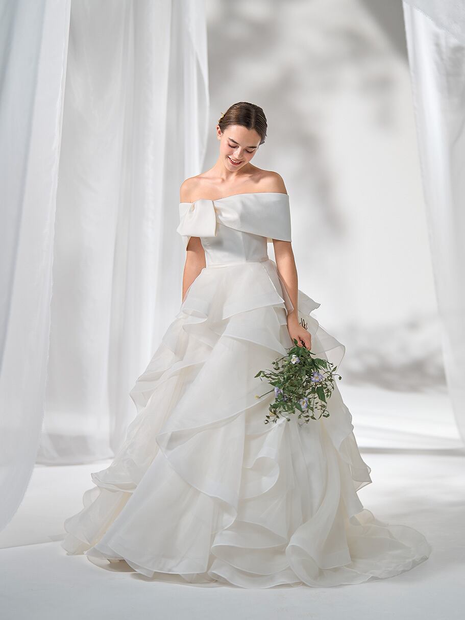 美品!パーティードレス ウエディングドレス ラッフルフリルオフショルダー 上質オーガンジー Aラインドレス ウェーブ ボリュームたっぷり