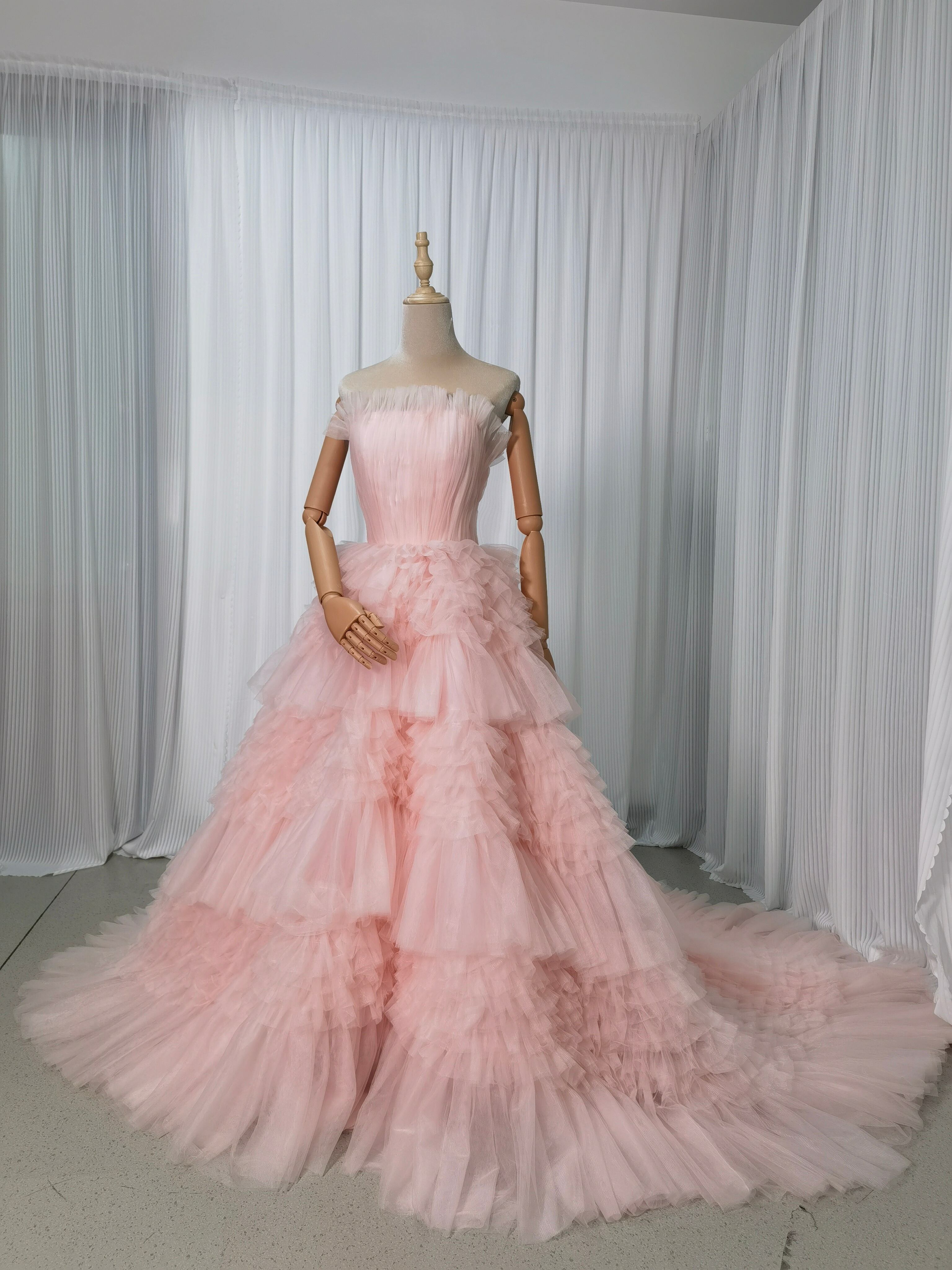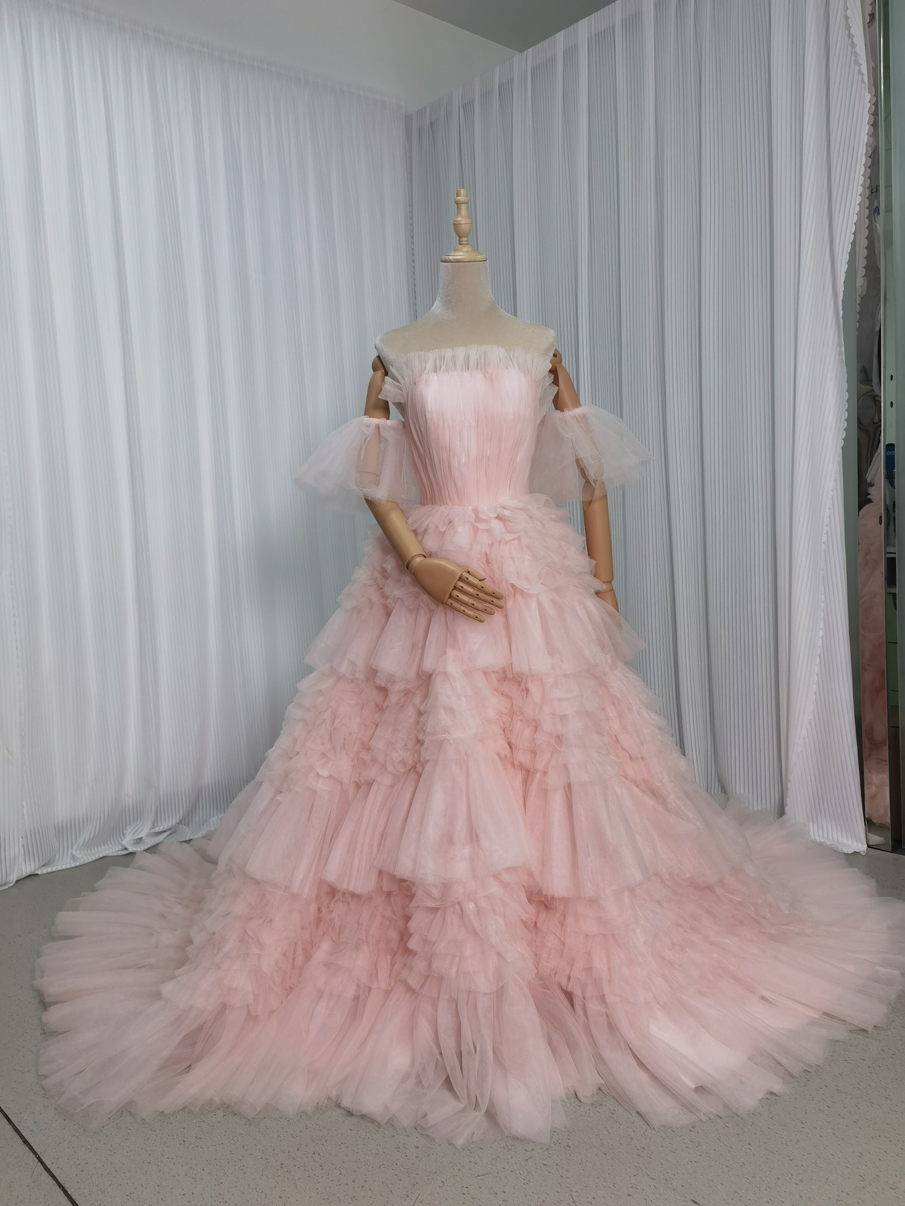 高品質!ピンク ベアトップ パフスリーブ カラードレス チュールドレス もこもこフリルドレス ボリューミー 前撮り