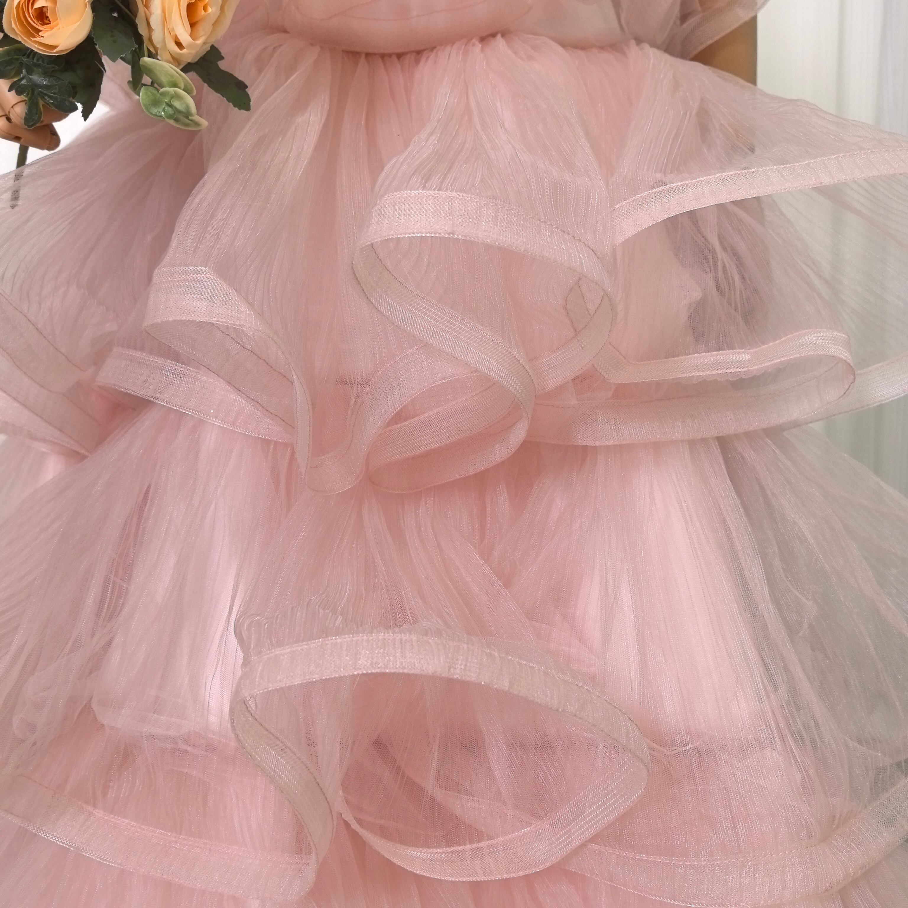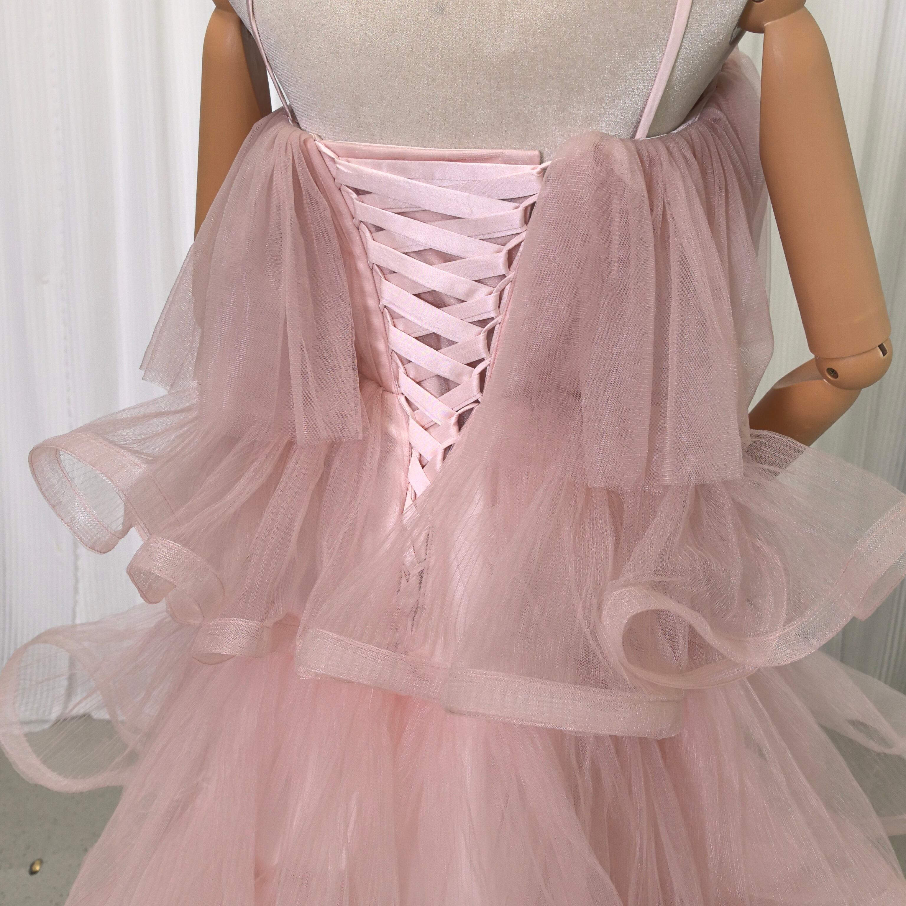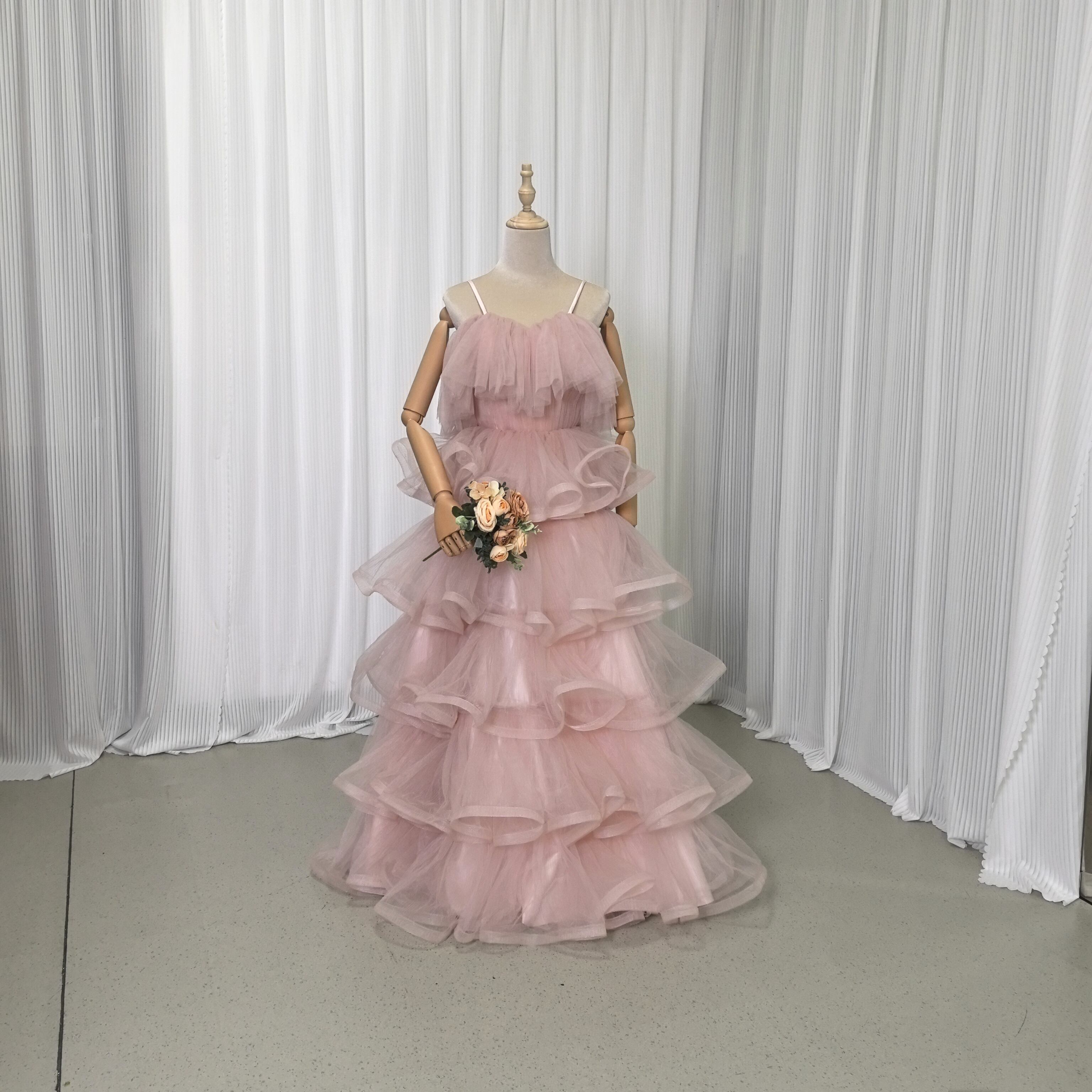 憧れのドレス ピンク キャミソール ロングドレス パーティードレス 編み上げ柔らかく重ねたチュールスカ