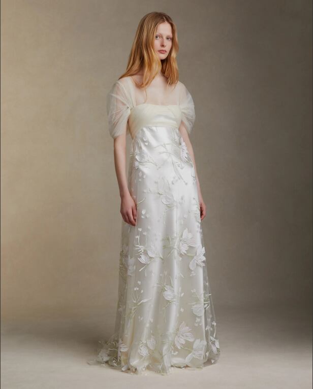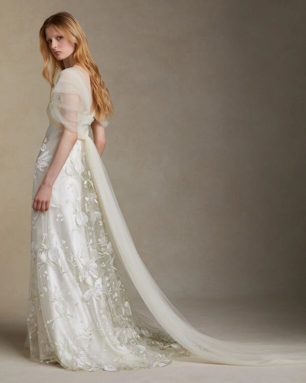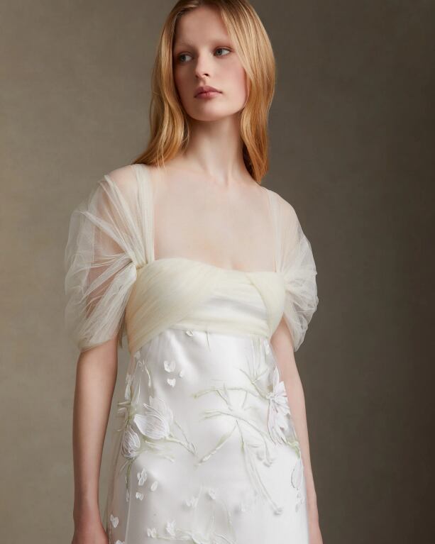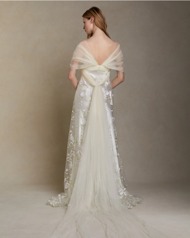 美品!チュール袖 3D立体レース刺繍 ストレートスタイル 美しいバックスタイル ラグジュアリーフェミニン ウエディングドレス パーティードレス