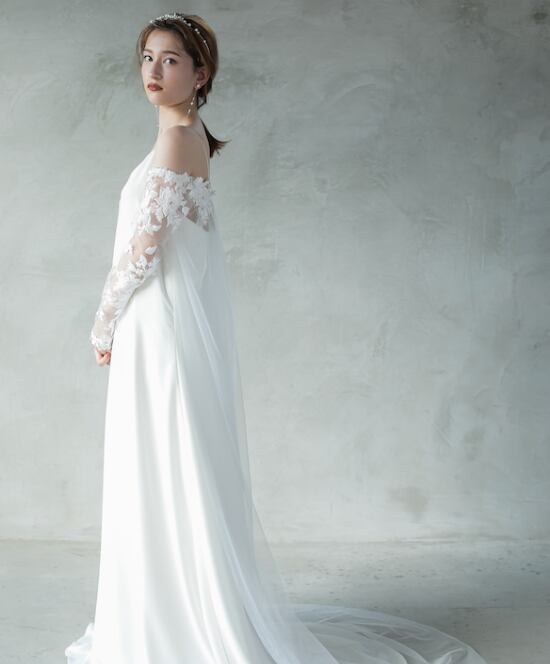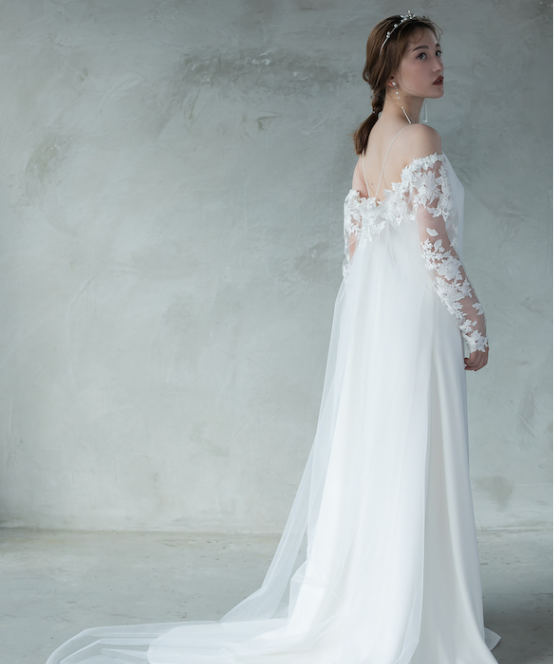 美品!チュール袖 マントトレーン 2WAYウエディングドレス キャミソールワンピース フラワーモチーフ ロングスリーブ パーティードレス