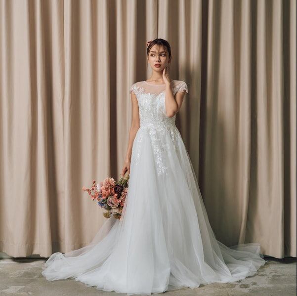 美品!半袖 Aラインドレス ウエディングドレス ふんわりチュールドレス キラキラフラワーモチーフ パーティードレス【オーダーメイド】