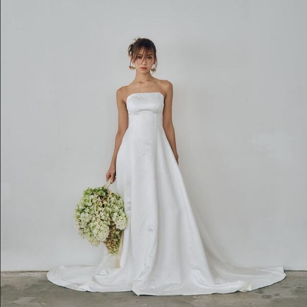 美品!ベア型 Aラインドレス 光沢サテン フェミニン ウエディングドレス イブニングドレス ミディアムドレス パーティードレス