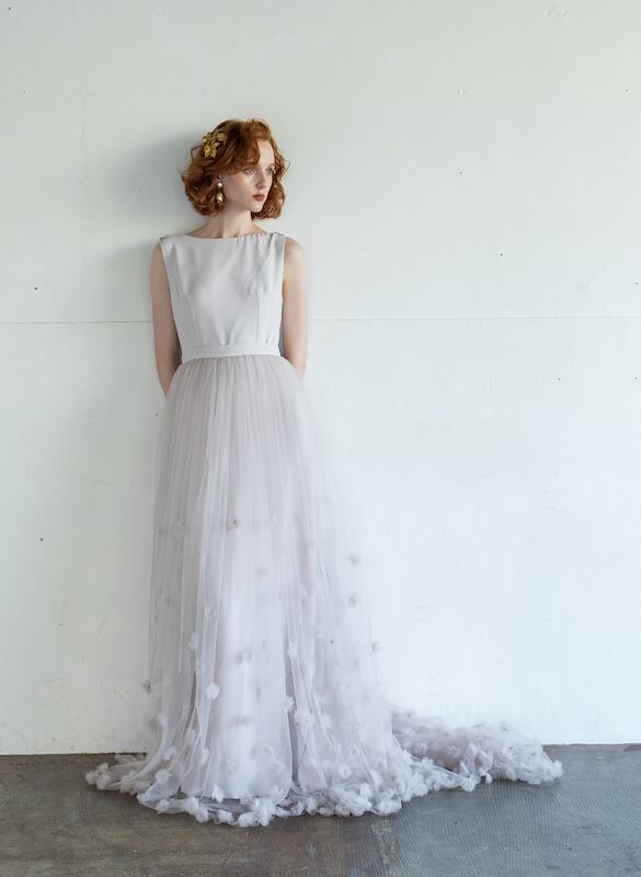 美品!ボートネック 3Dアップリケ ノースリーブ 2WAYウエディングドレス ふんわりチュールオーバードレス パーティードレス