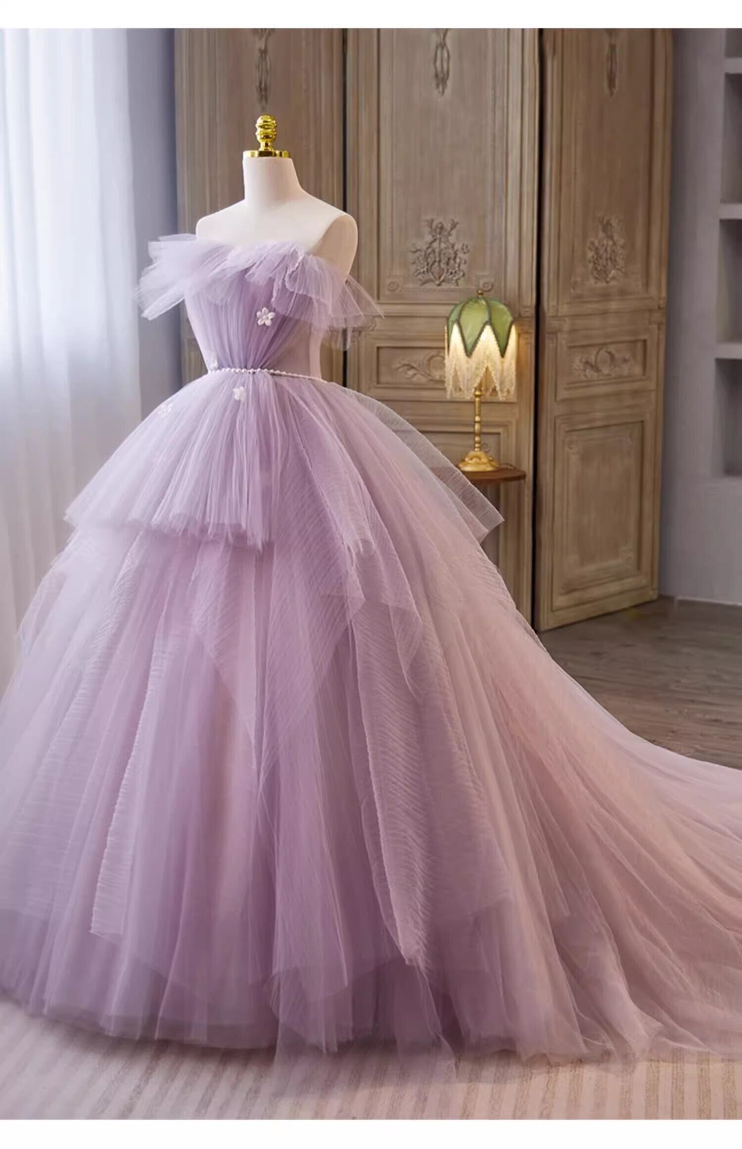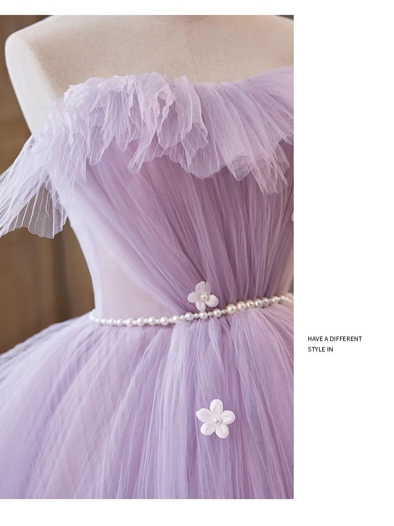 紫 ベアトップ パフスリーブ カラードレス チュールドレス もこもこフリルドレス ボリューミー 前撮り
