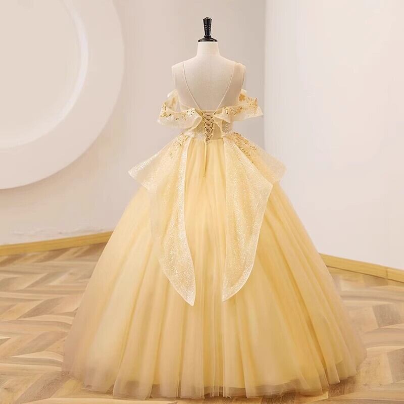 イエロー ベアトップ カラードレス チュールドレス キラキラのハンドビーディング プリンセスライン ボリューミー 前撮り