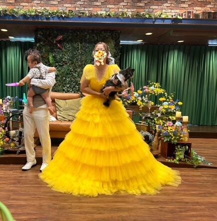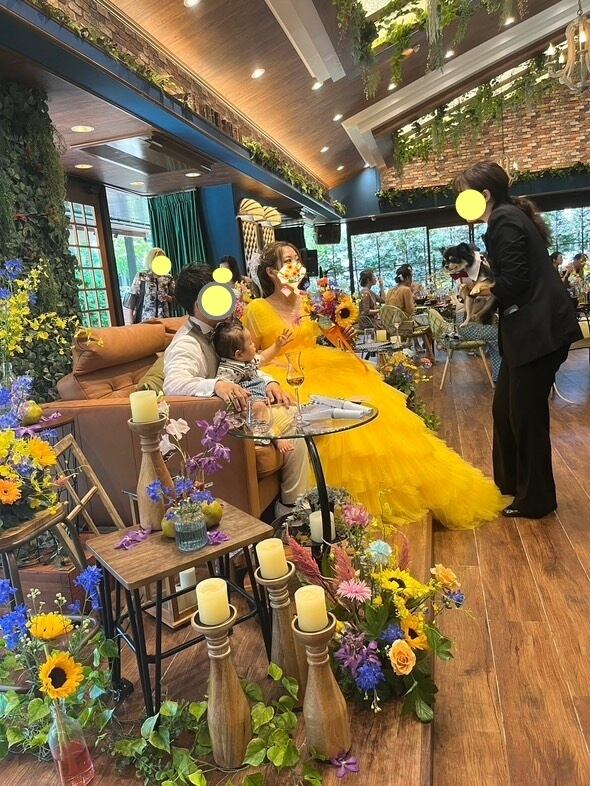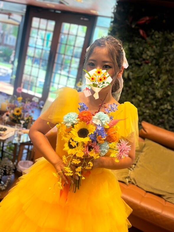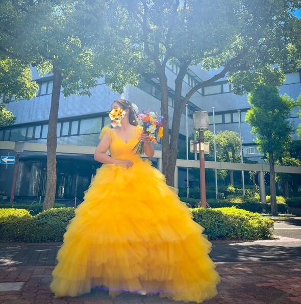 実例写真 韓国風ウエディングドレス ビビッドイエロー もこもこチュールドレス プリーツ ボリューム ネイビー オフショルダー 色オーダー可能