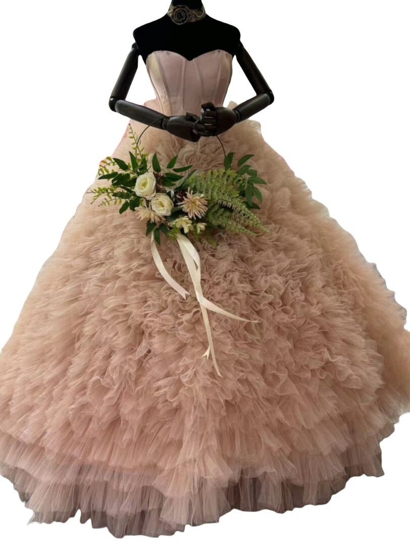 韓国風ウエディングドレス イエローカラードレス もこもこチュールドレス プリーツ ボリュームネイビー オフショルダー 色オーダー可能ティアードのドレス