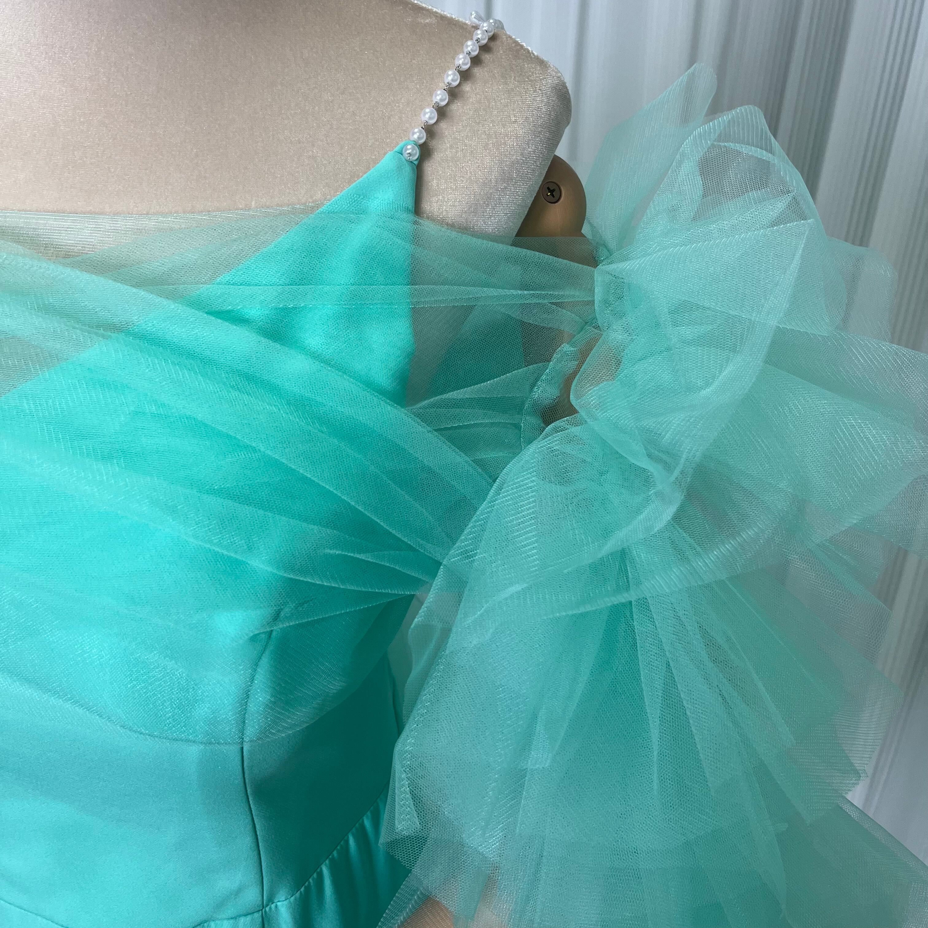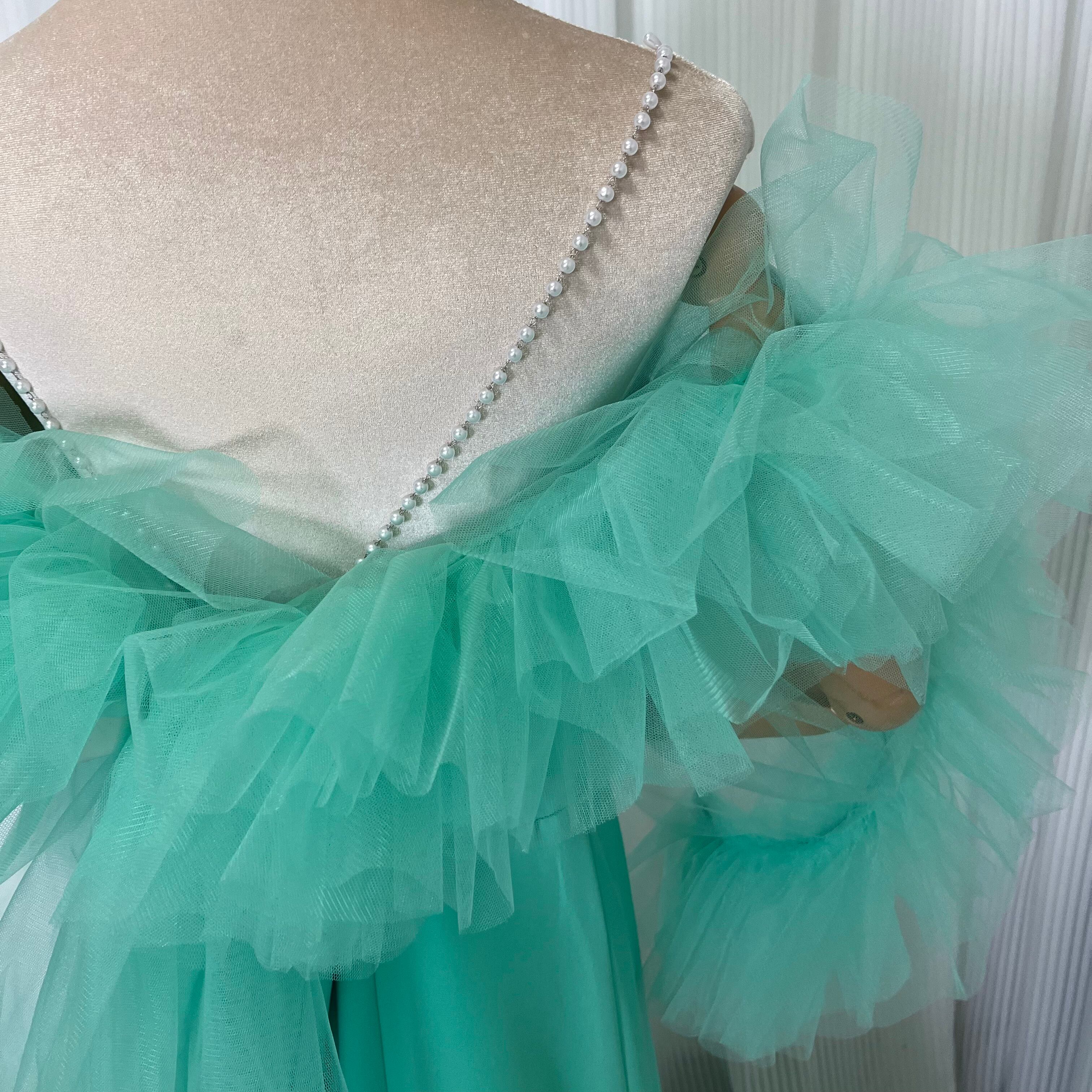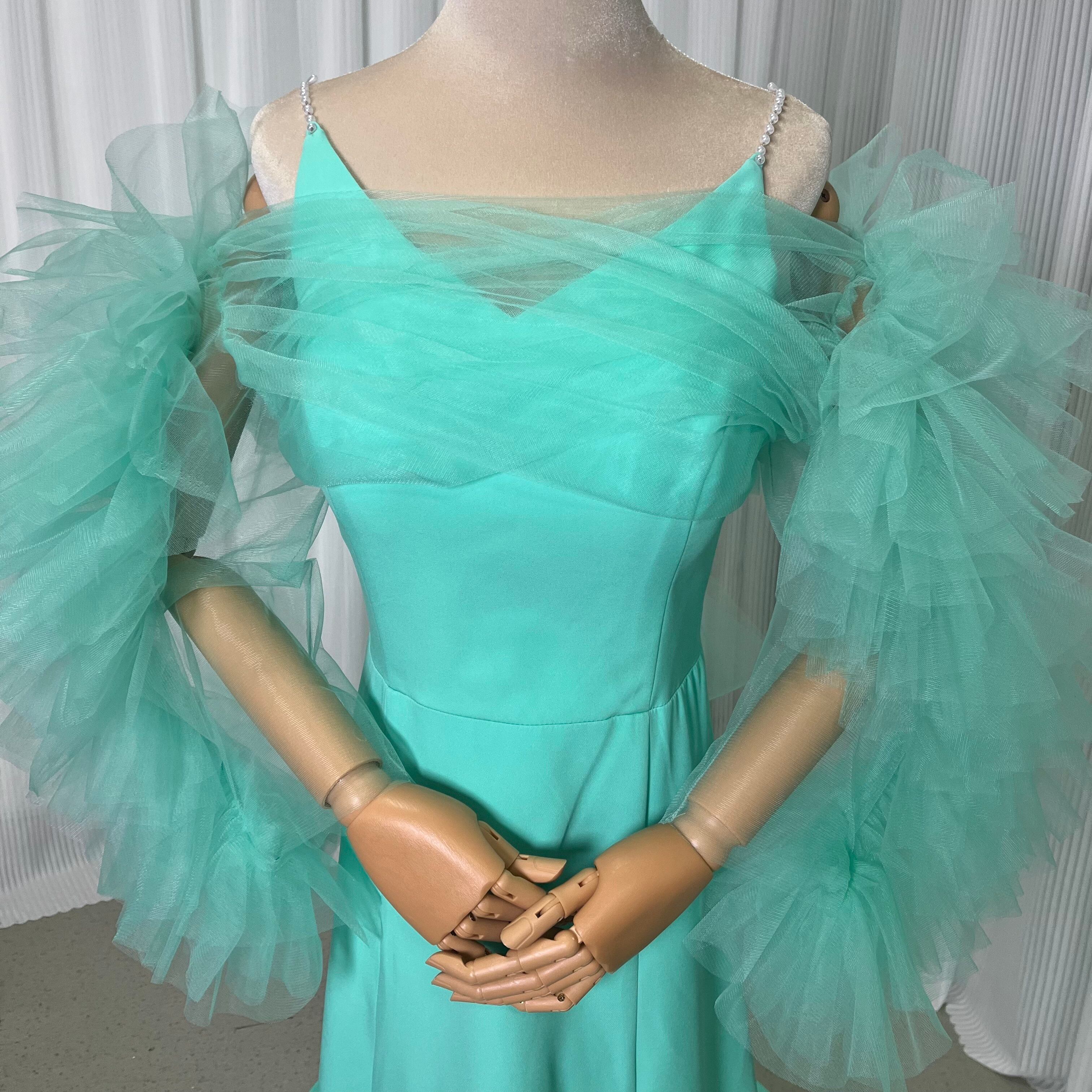 美品!グリーン パール キャミソール カラードレス パーティードレス 色変更可能+ソフトチュール フェミニンなフレームレースの袖トップス