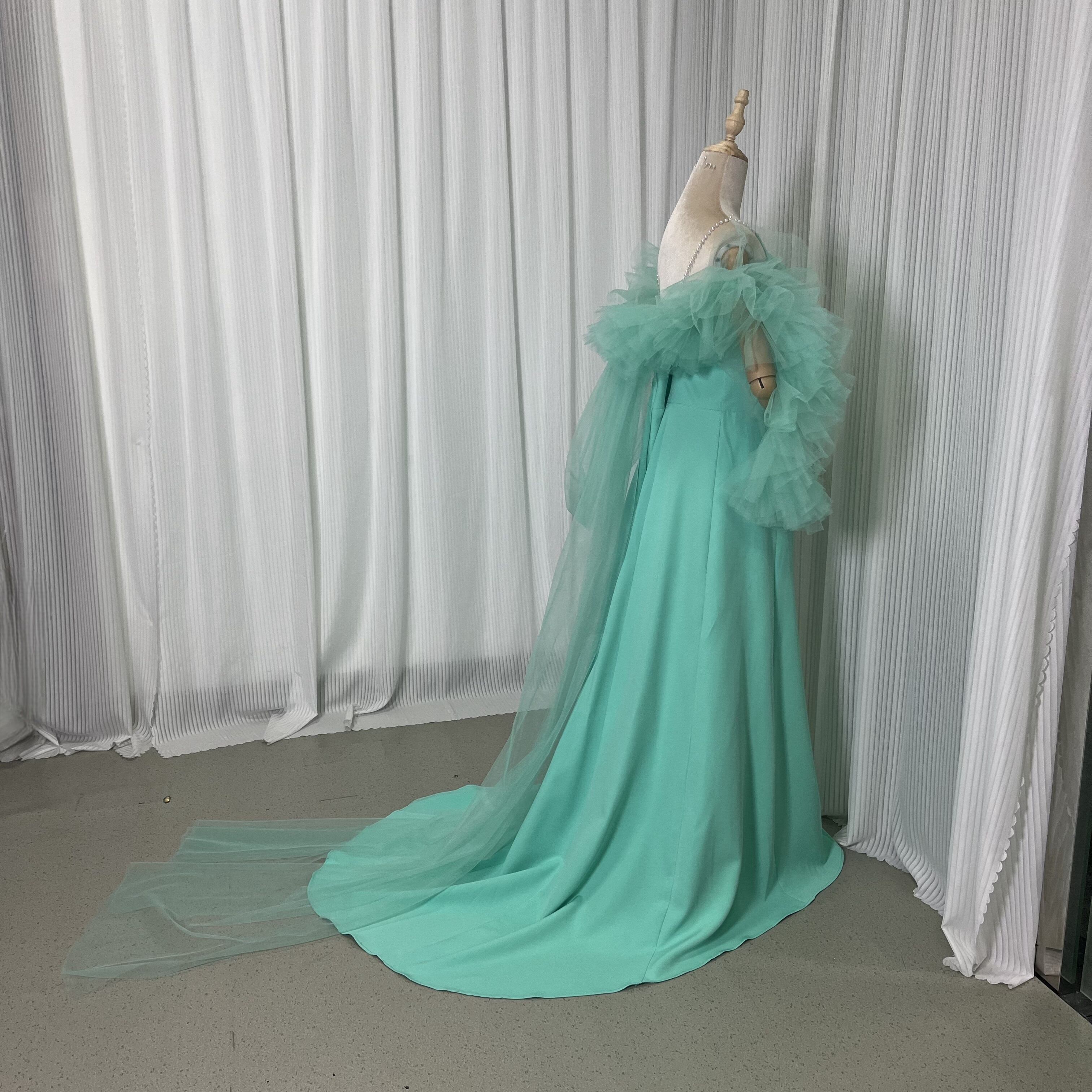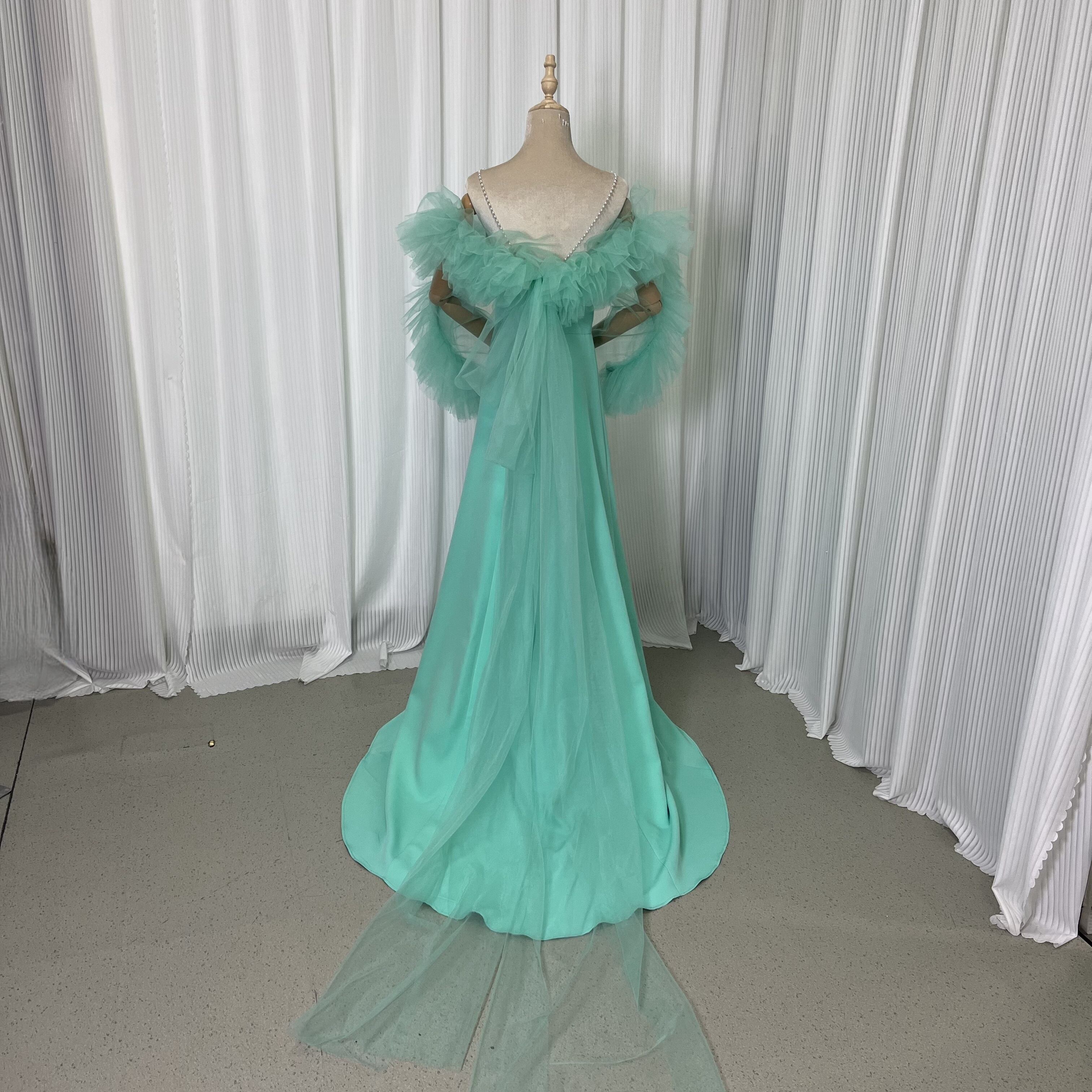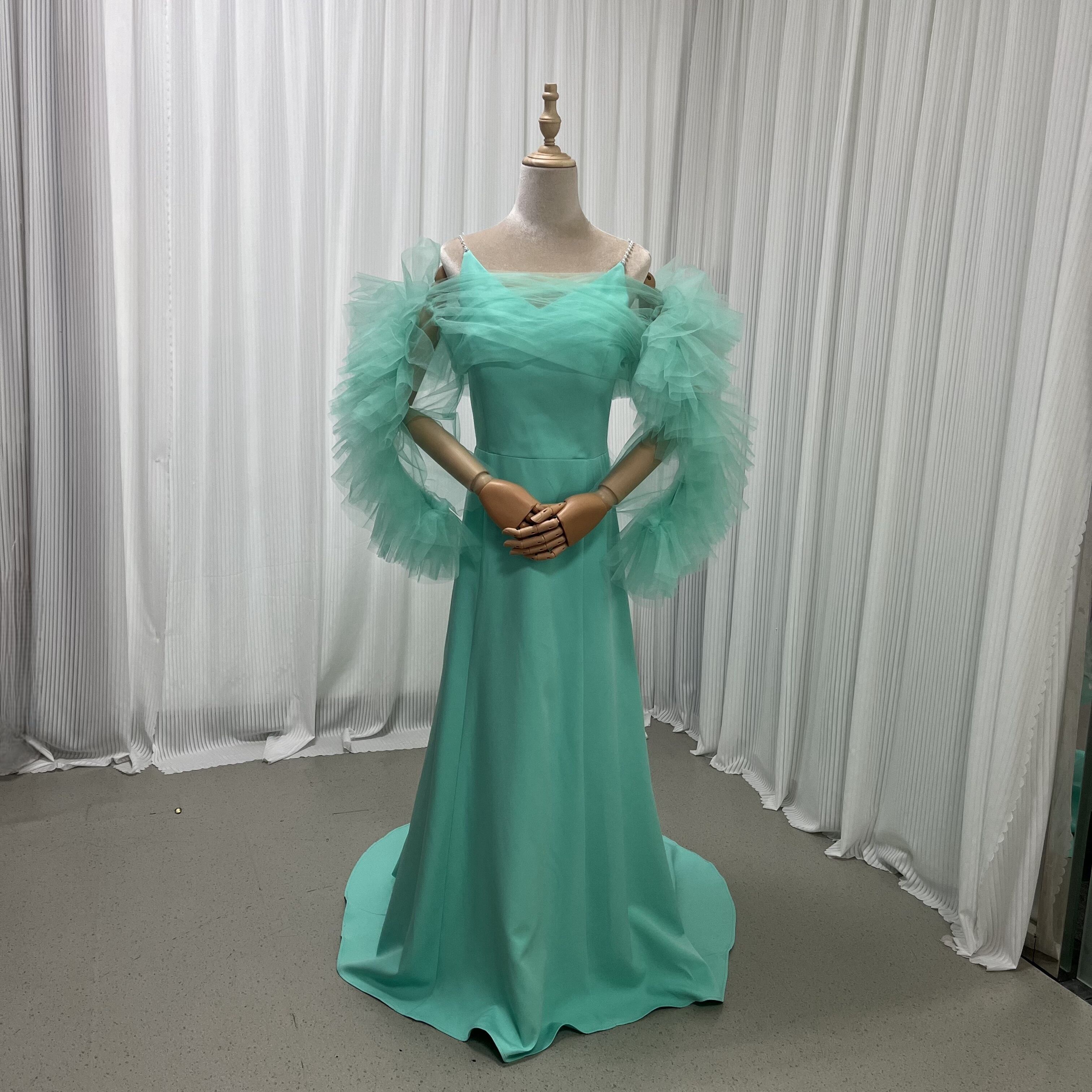 美品!グリーン パール キャミソール カラードレス パーティードレス 色変更可能+ソフトチュール フェミニンなフレームレースの袖トップス