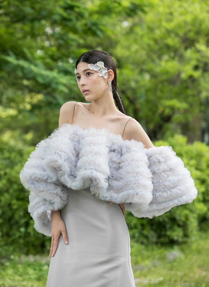 美品!韓国風ドレス ブルーグレー もこもこカラードレス ラッフルフリル ソフトマーメイド イブニングドレス チュールオーバードレス パーティードレス