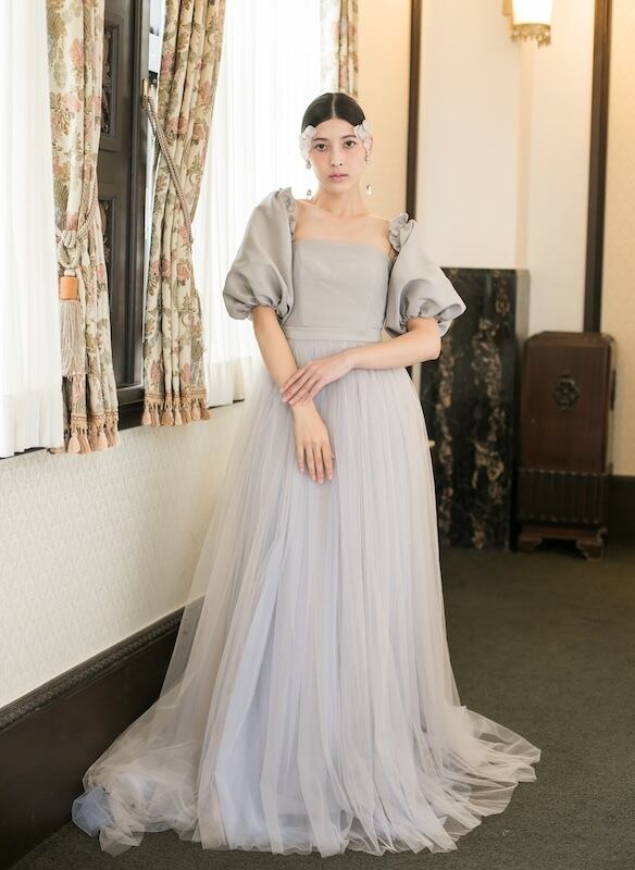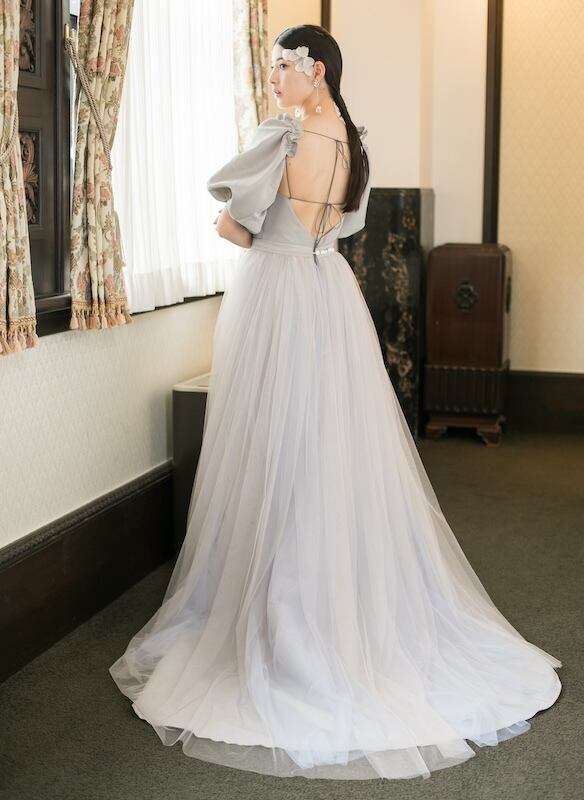 美品!取り外しパフスリーブ オーバードレス ブルーグレー カラードレス パーティードレス ミディアムドレス ソフトマーメイド 演奏会/コンサートドレス