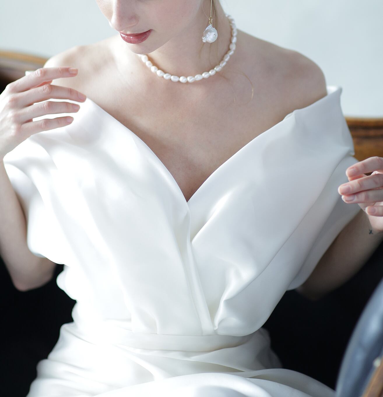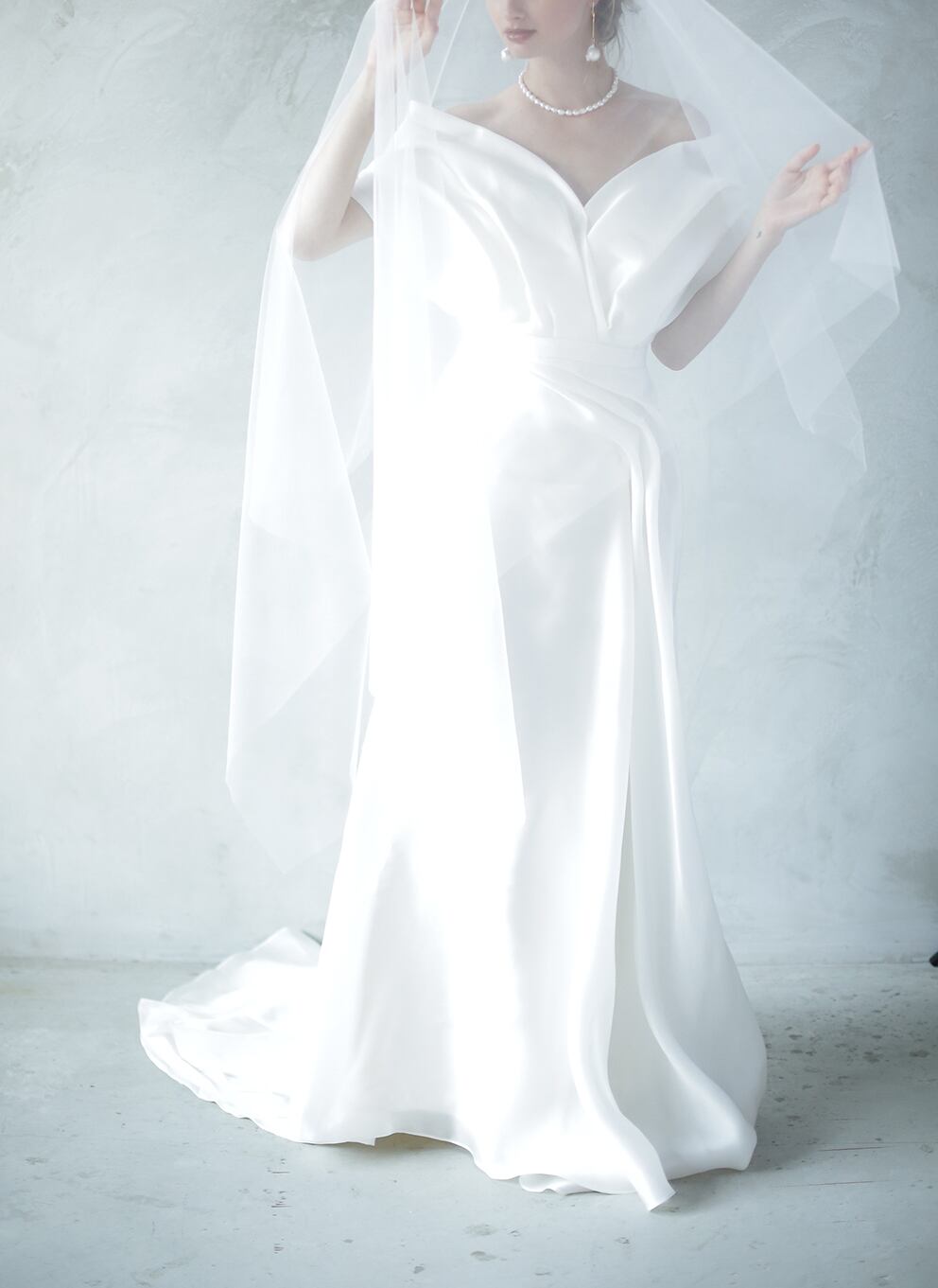 美品!オフショルダー スレンダーライン ウエディングドレス vネック 高みせ 細見えシルエット エンパイアライン 妊婦ドレス パーティードレス 色変更可能 | David1021k Dress(ダヴィドレス)