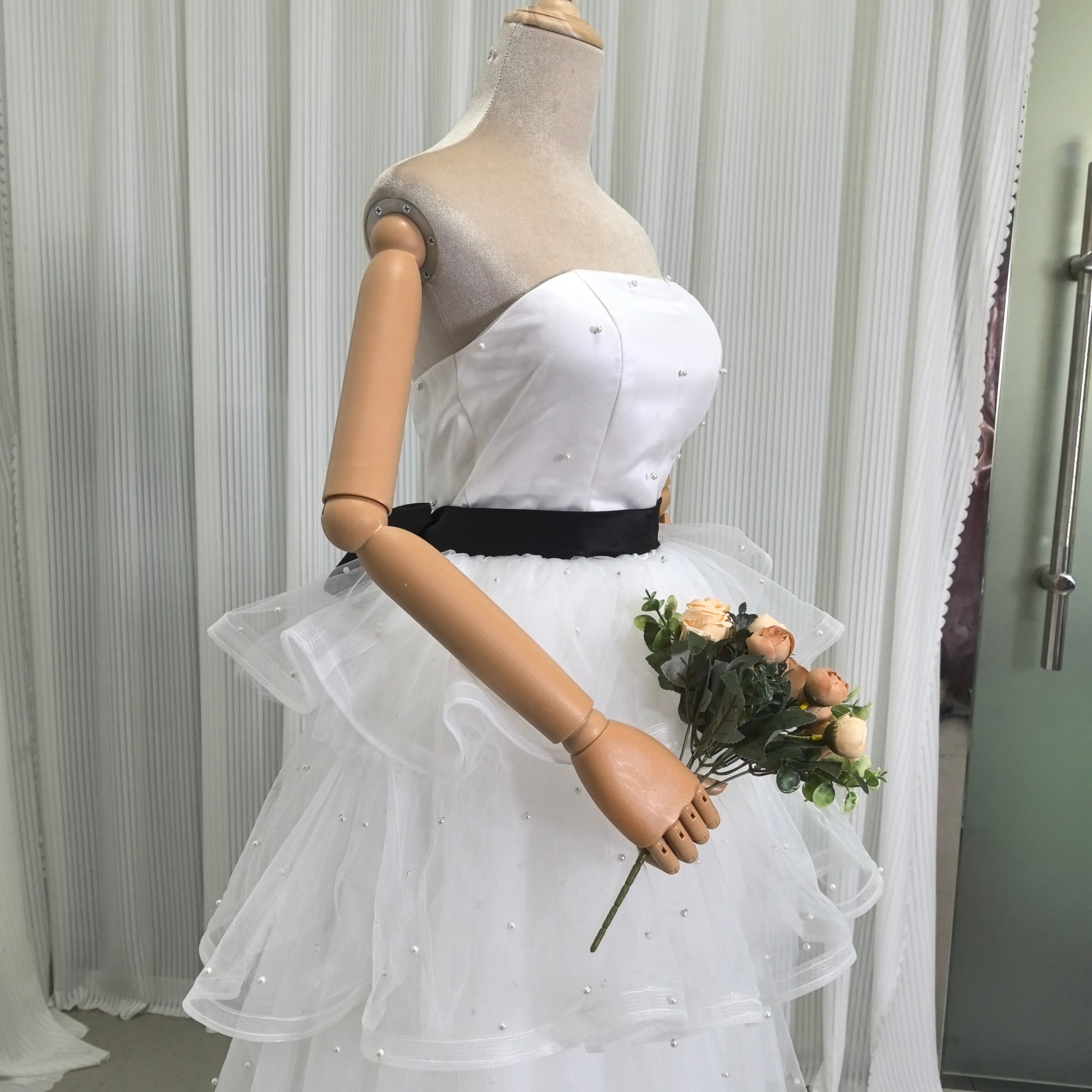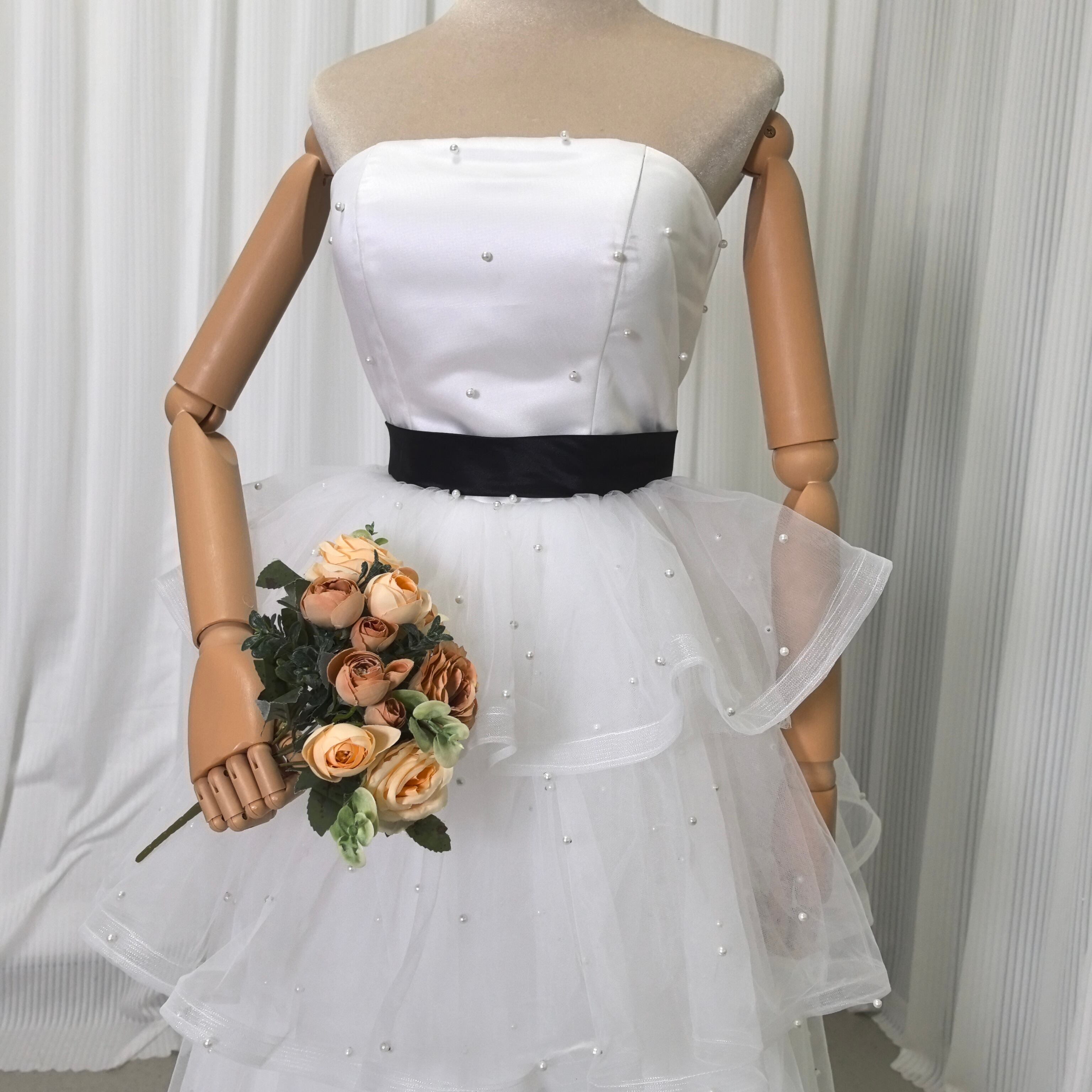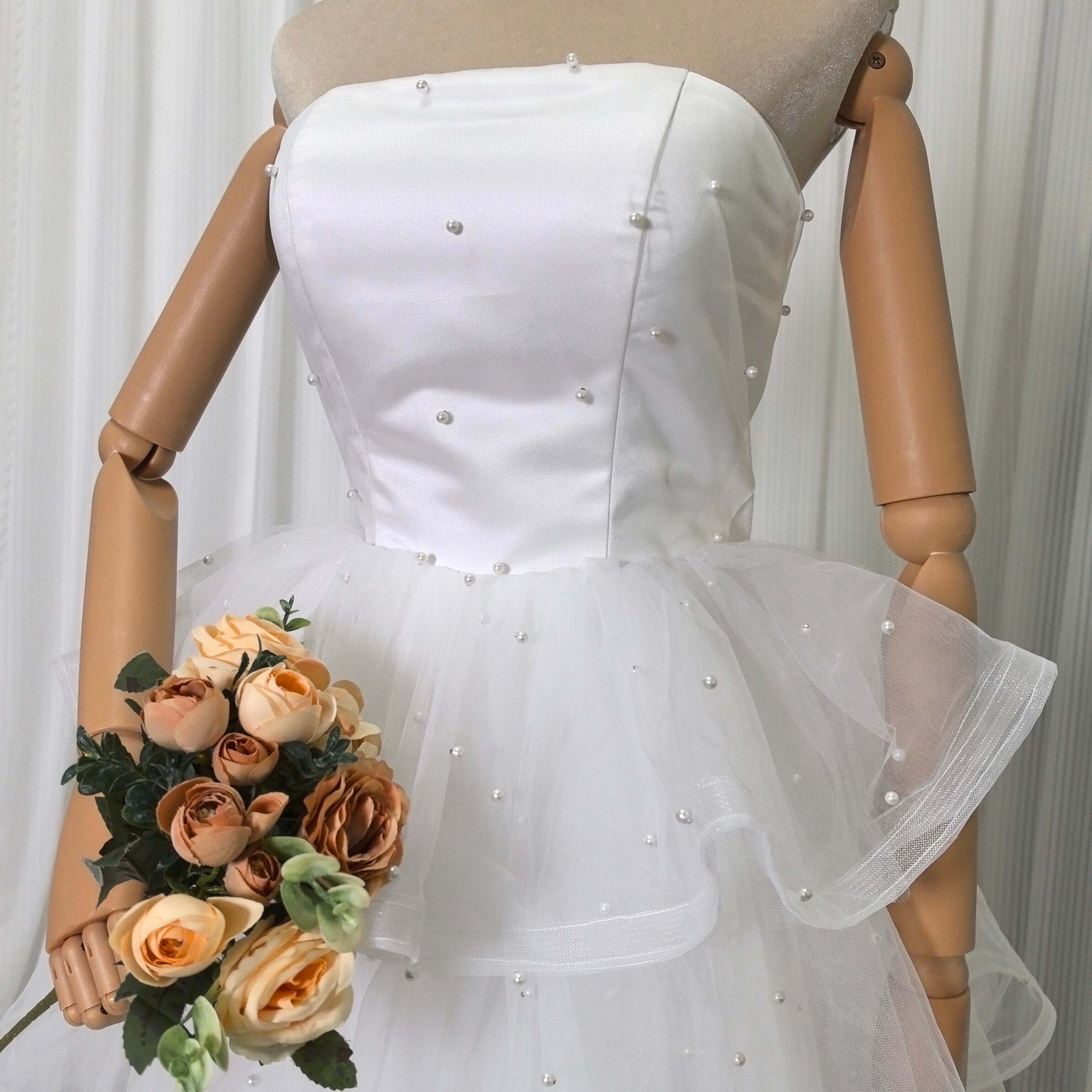 抜群のおしゃれ見え ベアトップ ウエディングドレス キラキラパールのチュールドレス ミニドレス 取り外しオフショルダー/挙式/前撮り