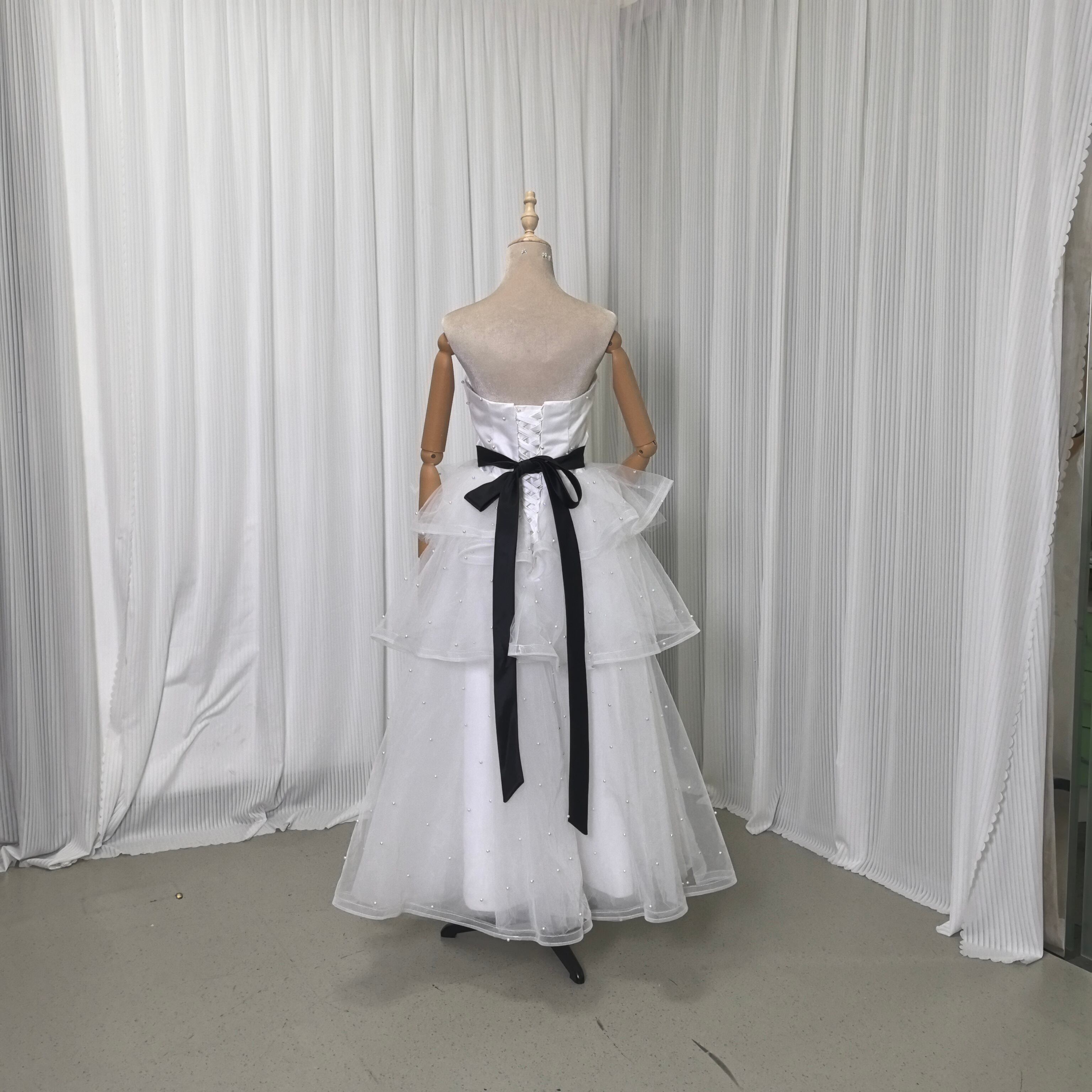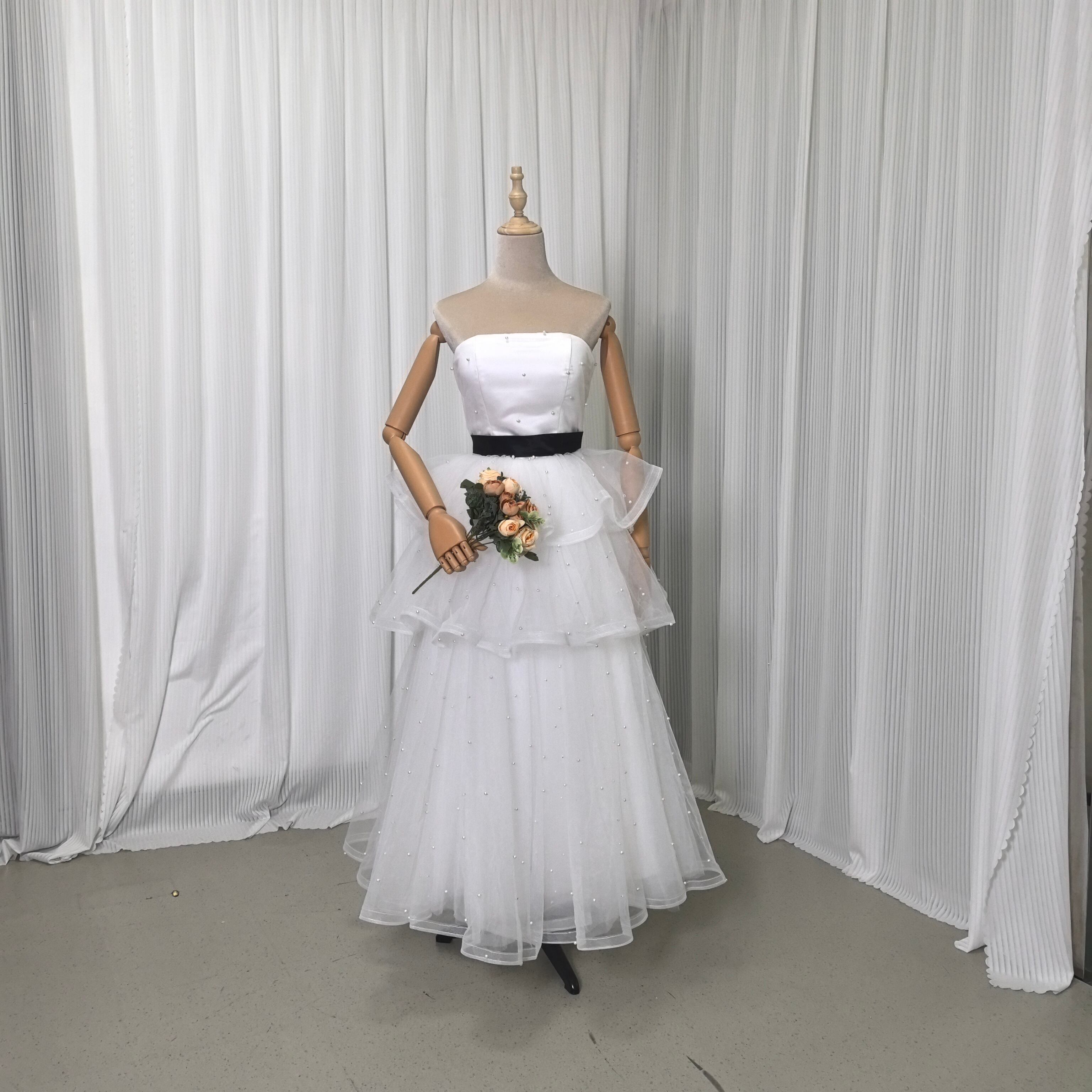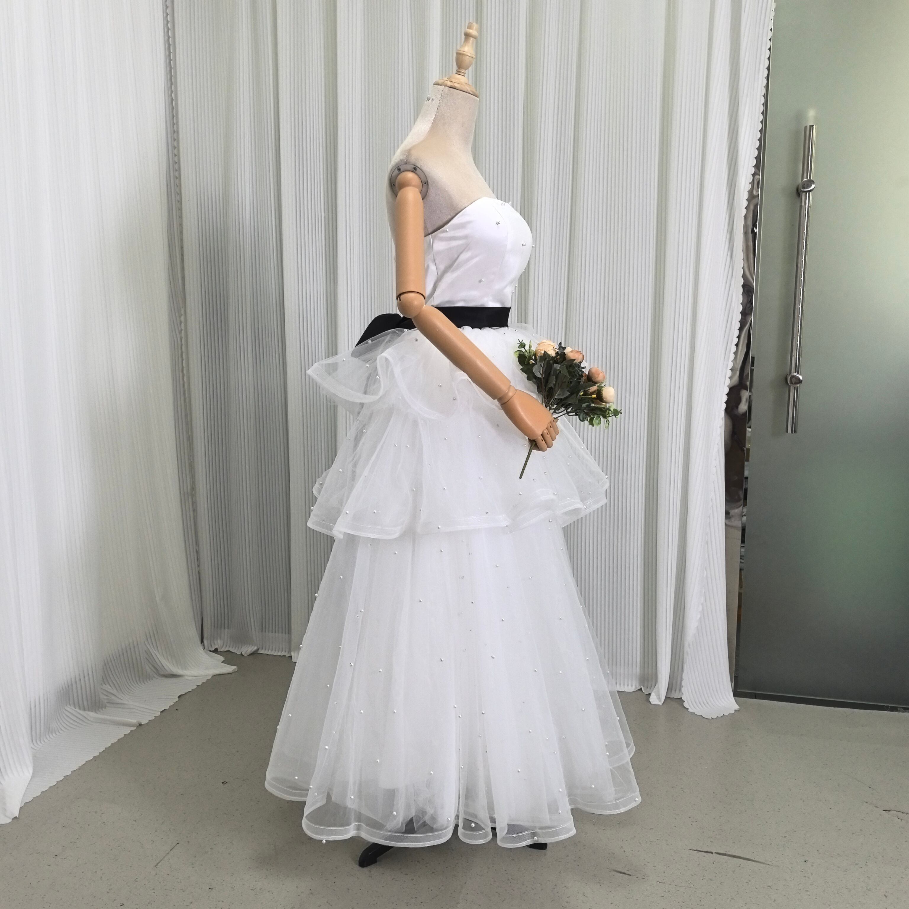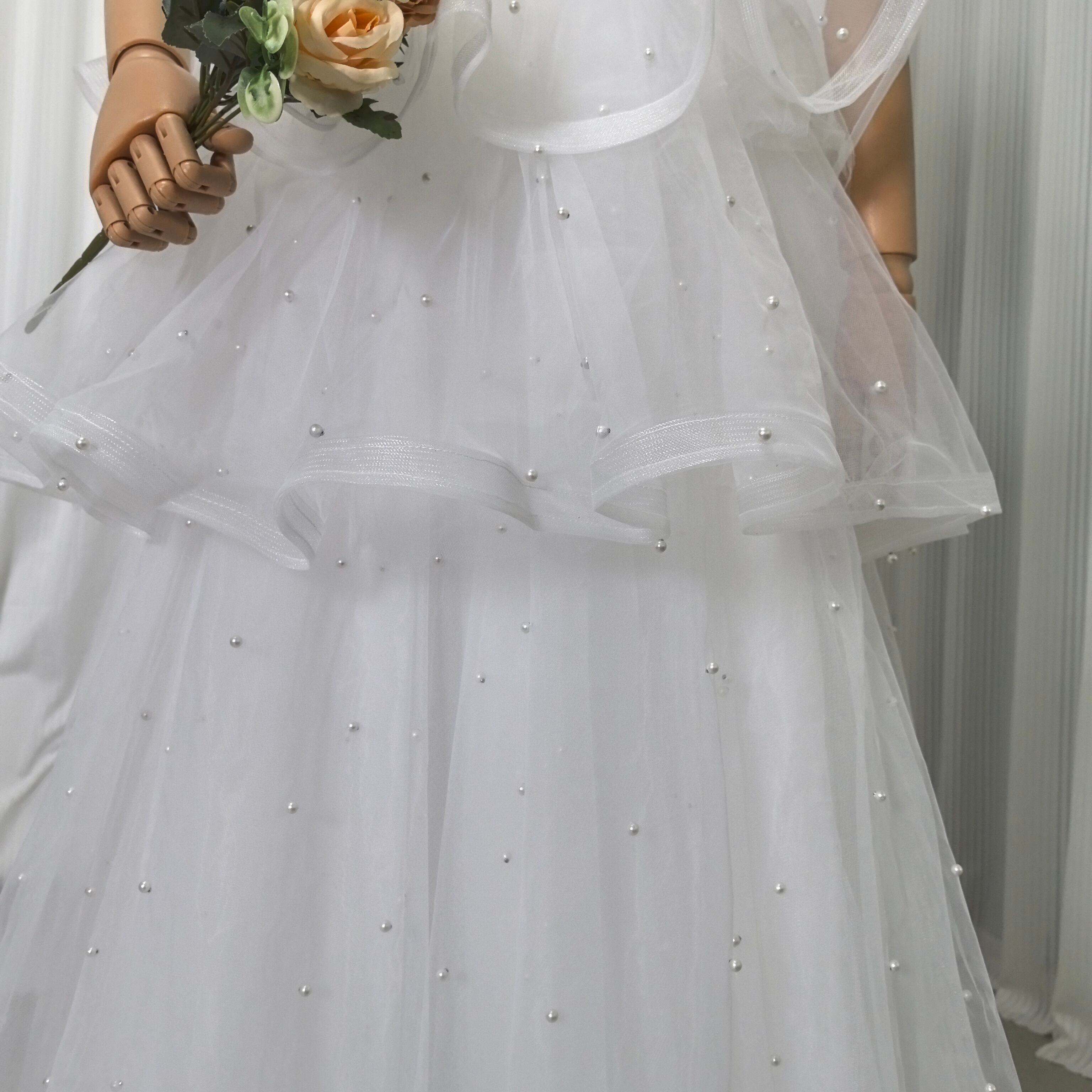 抜群のおしゃれ見え ベアトップ ウエディングドレス キラキラパールのチュールドレス ミニドレス 取り外しオフショルダー/挙式/前撮り